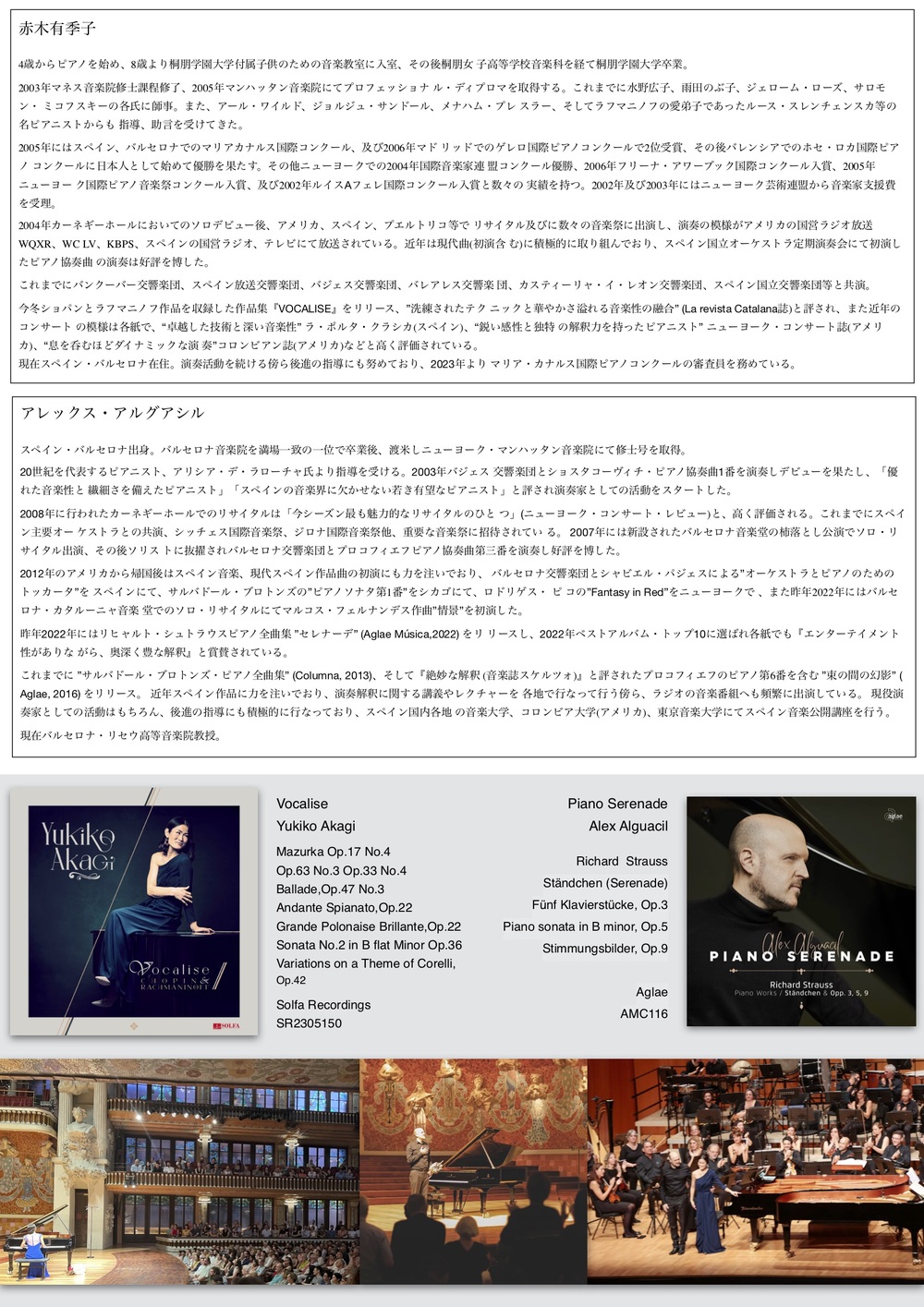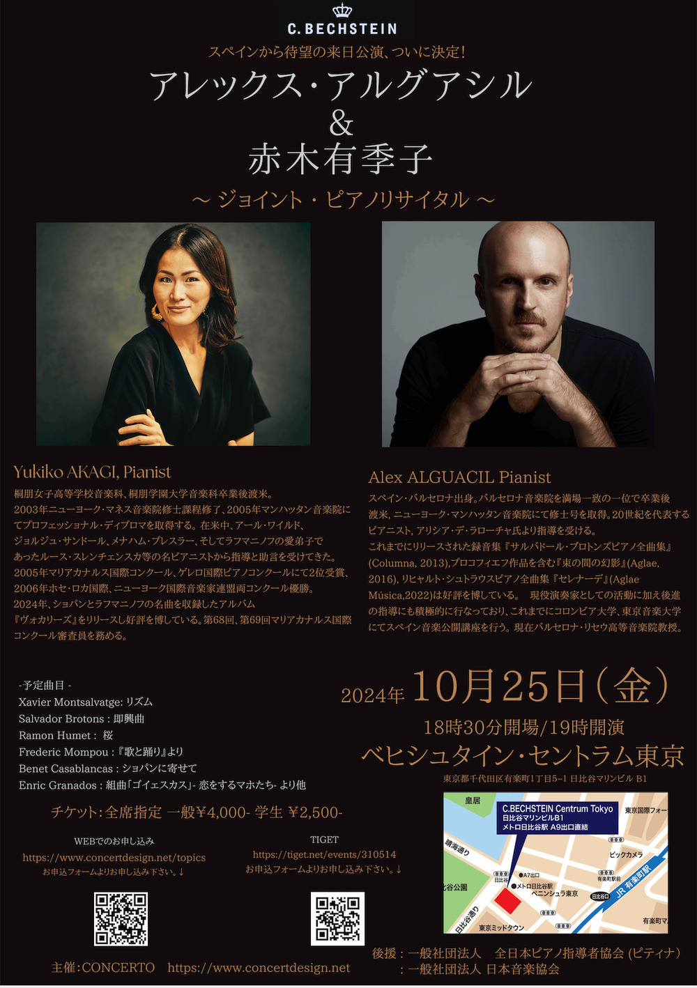 昨年リリスホールを沸かせたピアニスト アレックス・アルグアシル&赤木有季子ジョイントリサイタル。今年は10/25ベヒシュタイン・セントラム東京にて開催。日本ではまだ上演されることが少ないフェデリコ・モンボウ / ラモン・フィメット / サルバドール・ブロントス etc スペイン・カタルーニャ地方の作曲家の作品を中心に構成されています。世界的に活躍をされているアレックス・アルグアシルさんと数々の国際コンクールで高い評価を得た後に現在はスペインに拠点を置き国際コンクールの審査員を務める等精力的に活動を行う赤木有季子さんによるジョイントリサイタル、この機会に是非ご来場ください。