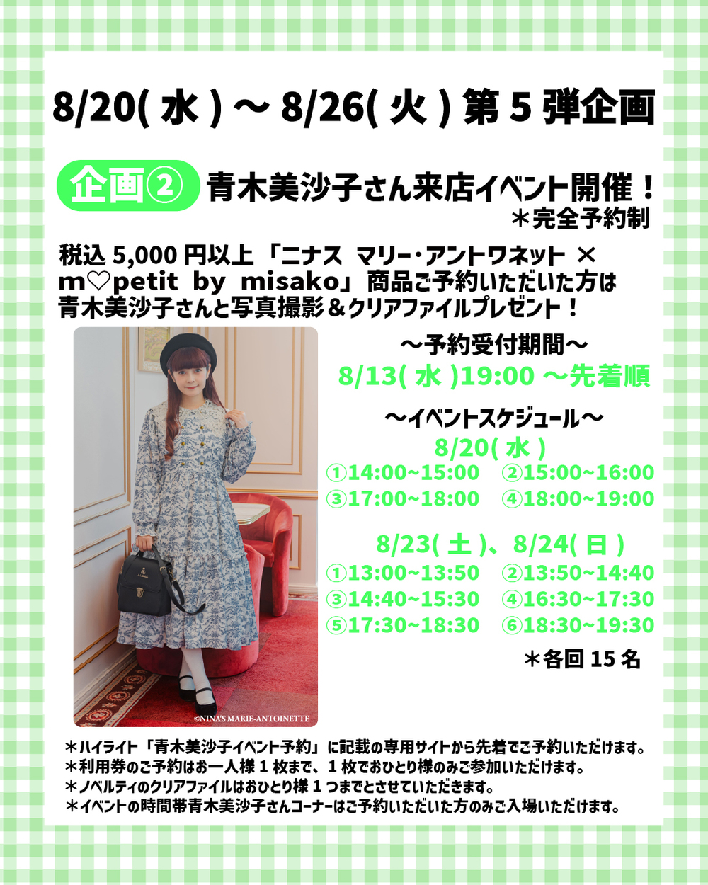 8/20(水)、8/23(土)、8/24(日)に開催する、青木美沙子さん 来店イベント時の 入場券(予約券)です。
