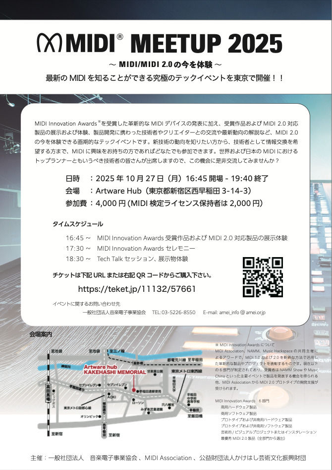 製品開発に携わった技術者やクリエイターと直接対話いただけます。リアルな開発現場の声を聞きながら、製品の背景や技術的な工夫について深く知ることができます。また、MIDI の標準化を推進する団体のメンバーも参加しております。技術的な疑問やアイデアを共有し、MIDI の未来について語り合う貴重な機会となるでしょう。