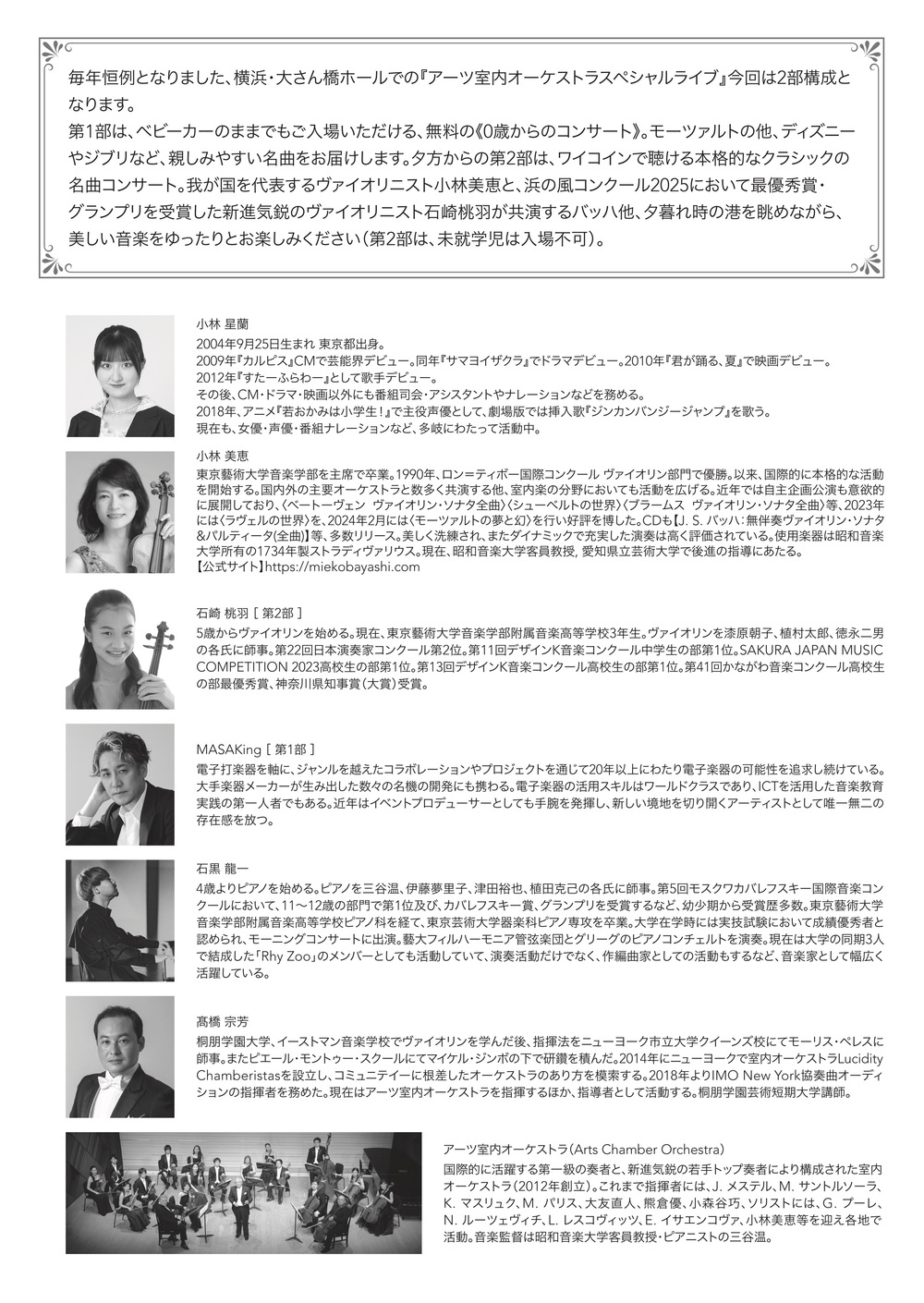 第1部は、ベビーカーのままでもご入場いただける、無料の《0歳からのコンサート》。モーツァルトの他、ディズニーやジブリなど、親しみやすい名曲をお届けします。