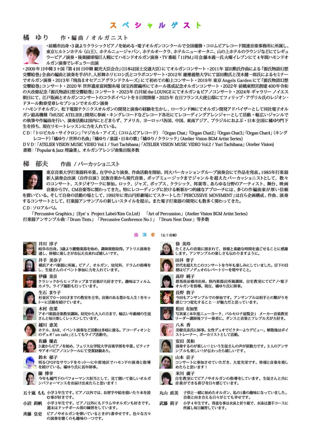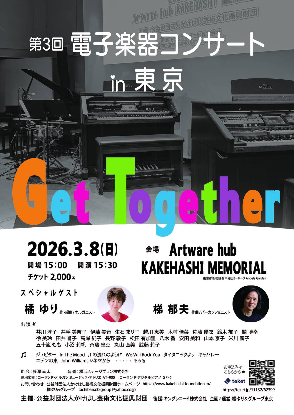 アレンジャー、プレーヤーとして国内外で活躍中の橘ゆり氏と日本を代表するパーカッショニスト梯郁夫氏をスペシャルゲストに迎え、全国各地で活躍するプレーヤーや小学生から大人までの出演者が「Get Together」、個性豊かな演奏をおとどけいたします。