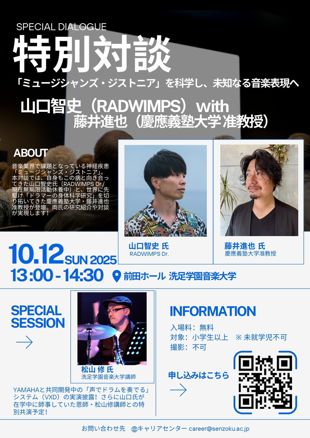 本対談では、自身もこの病と向き合ってきた山口智史氏(RADWIMPS Dr./現在は無期限活動休養中)と、世界に先駆けて「ドラマーの身体科学研究」を切り拓いてきた慶應義塾大学・藤井進也准教授が登壇します。