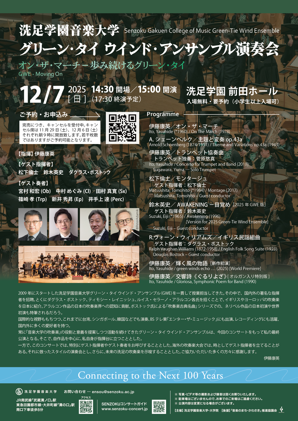 常に「音楽大学の吹奏楽」の役割と意義を提案しつつ活動を続けてきたグリーン・タイ ウインド・アンサンブルは、今回のコンサートをもって私の最終公演となる。そこで、自作品を中心に、私自身が指揮台に立つこととした。