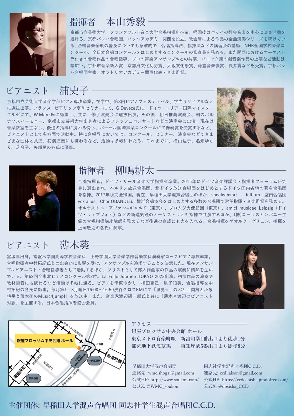 同志社にご縁のある方、早稲田にご縁のある方、純粋に合唱がお好きな方、どなたにもお楽しみいただける演奏をお届けいたします。ぜひご来場いただけますと幸いです。