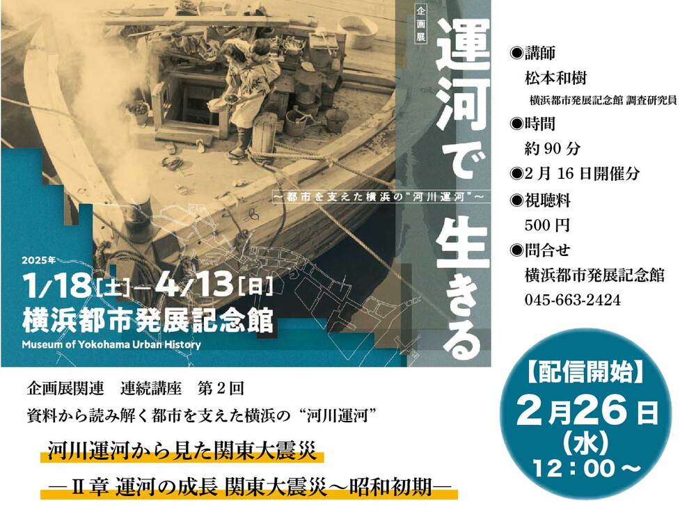 2025年1月18日(土)から横浜都市発展記念館で開催している企画展「運河で生きる ~都市を支えた横浜の“河川運河”~」関連の連続講座。