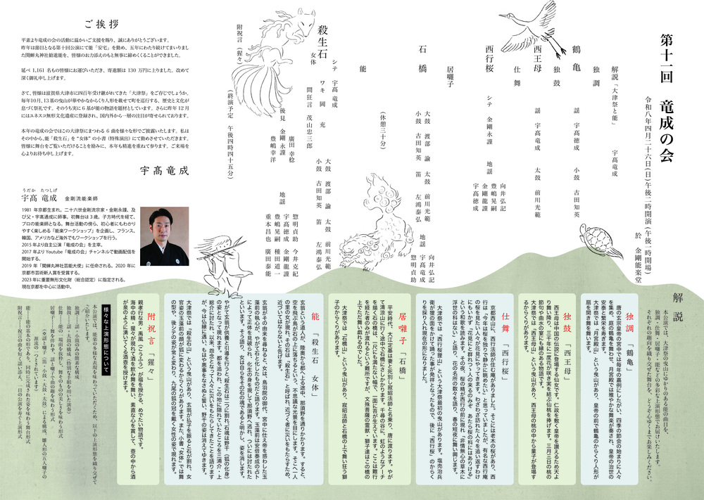 本年の竜成の会ではこの大津祭にまつわる6曲を様々な形でご披露いたします。私はその中から、能「殺生石」を“女体”の小書(特殊演出)にて勤めさせていただきます。