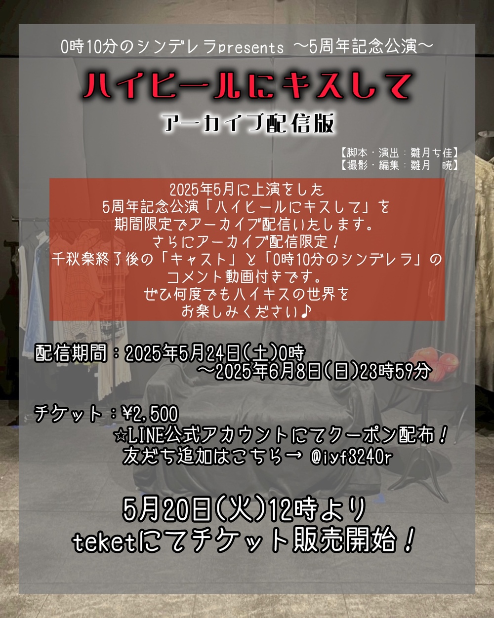 2025年5月に上演をした、5周年記念公演「ハイヒールにキスして」を期間限定でアーカイブ配信いたします。さらにアーカイブ配信限定の、千秋楽終了後のキャストと0時10分のシンデレラのコメント動画付きです!