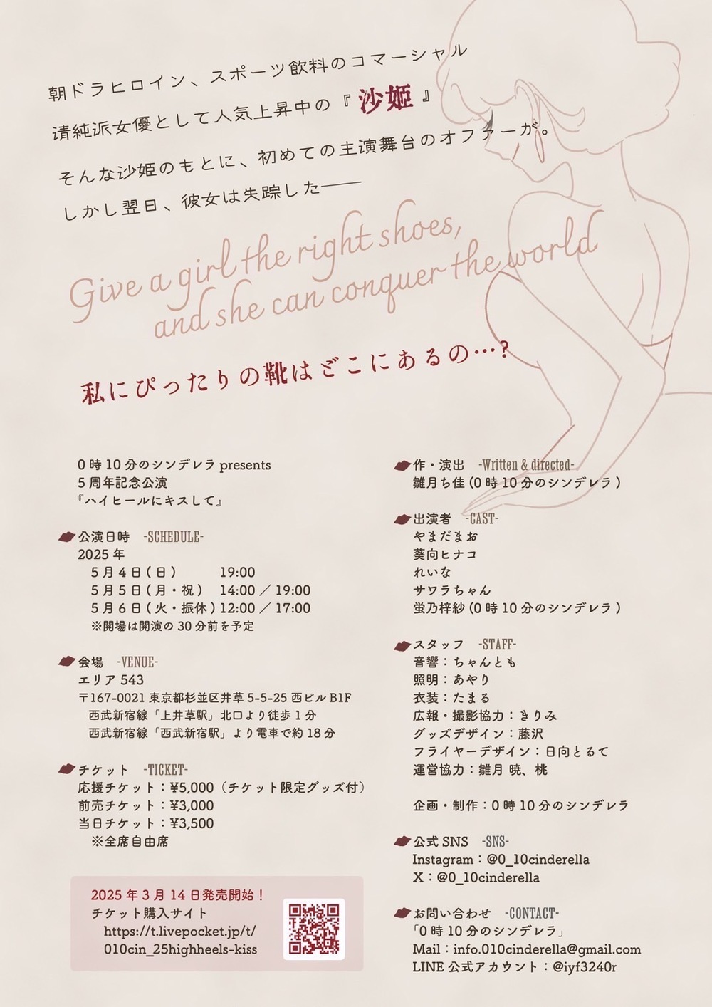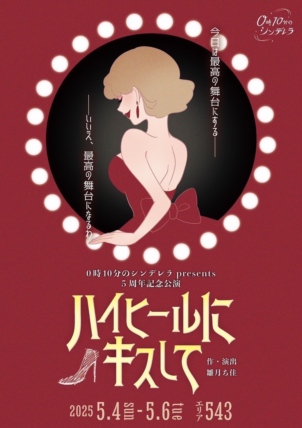 その応援プロジェクトとして、2025年5月に上演をした、5周年記念公演「ハイヒールにキスして」を期間限定でアーカイブ配信いたします。さらにアーカイブ配信限定の、千秋楽終了後のキャストと0時10分のシンデレラのコメント動画付きです!