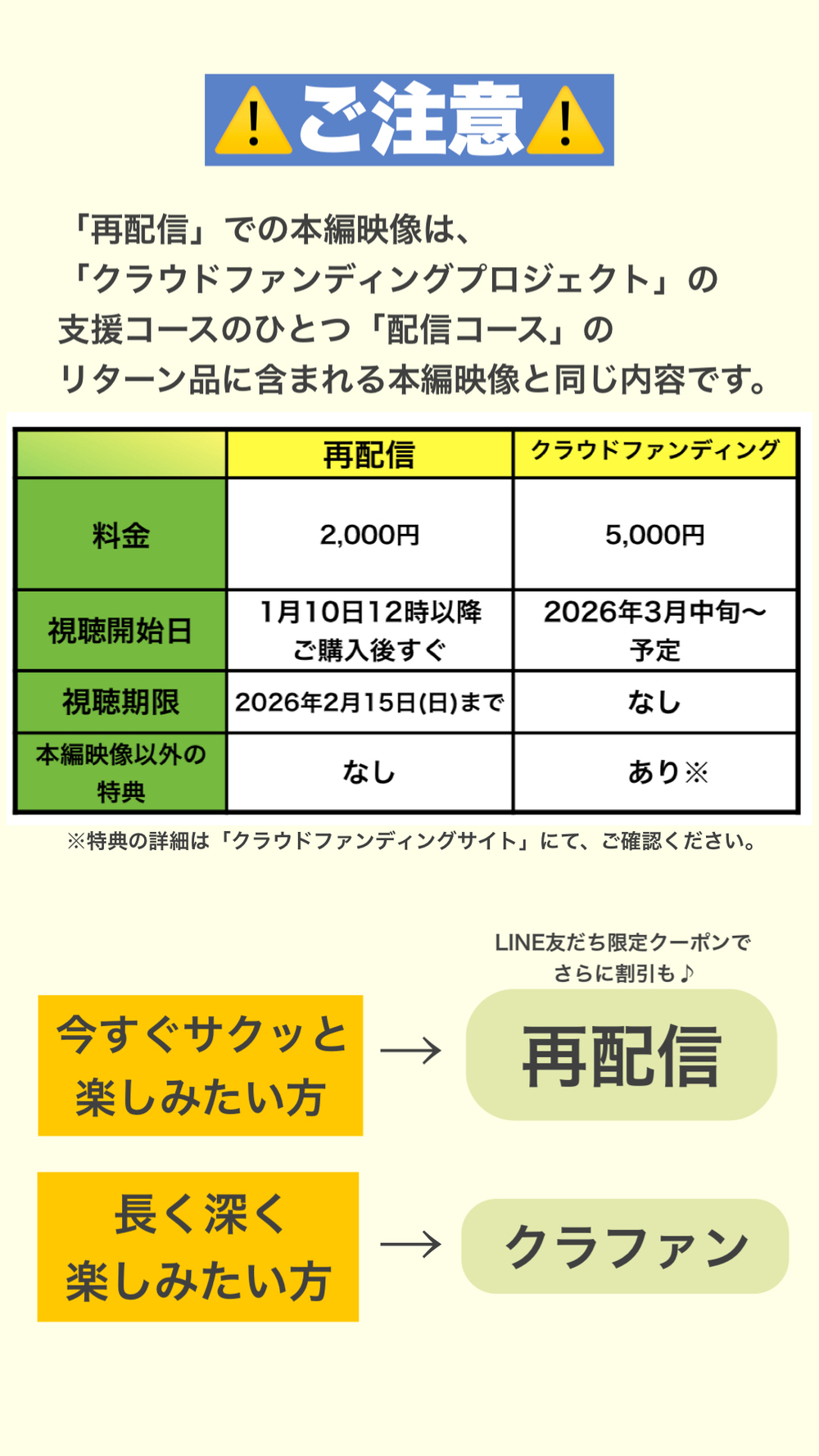 こちらの配信映像は、現在進行中のクラウドファンディングプロジェクトの支援コースのひとつ「配信コース」のリターン品に含まれる本編映像と同じ内容です。クラウドファンディング限定の「上演台本」「制作裏話動画」は付きませんので、お間違いのないようご注意ください。