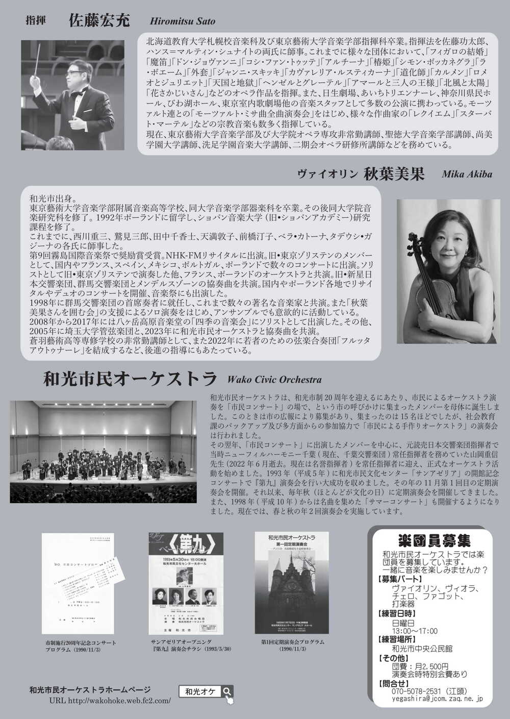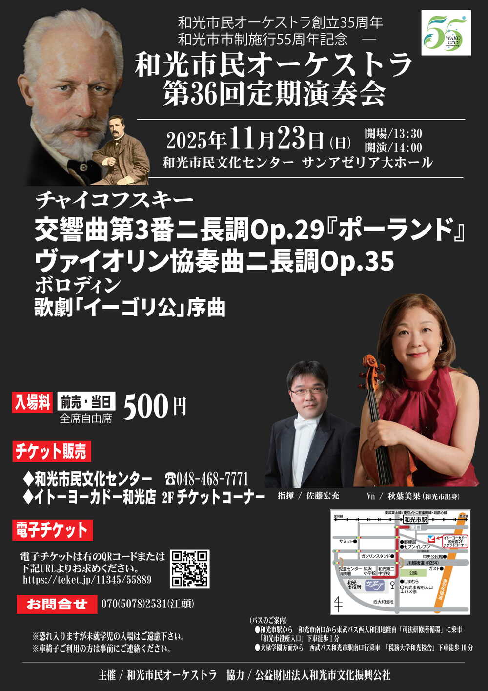 和光市出身のヴァイオリン奏者「秋葉 美果」が、チャイコフスキーのヴァイオリン協奏曲のソロを奏でます。この機会にぜひご来場ください。