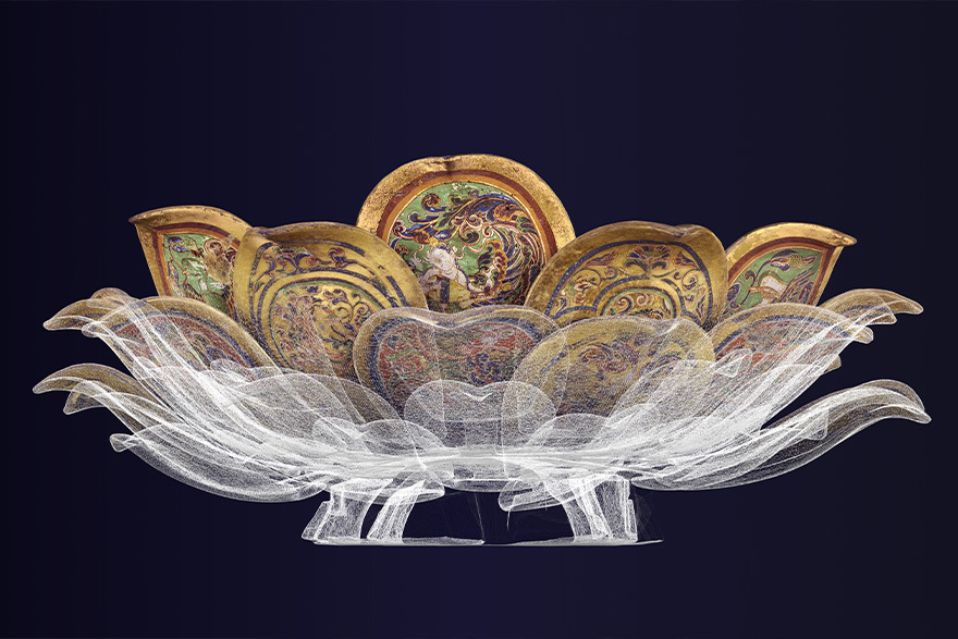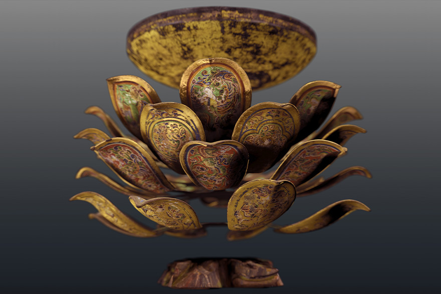 「愛 美 紡ぐ」をテーマに宝物の背景にあるさまざまなストーリーを紐解きます。 宝物を360度からスキャンして取得された高精細な3Dデジタルデータに演出を施した展示を行い、宝物の細部や質感をリアルに感じていただけるのも本展ならでは。