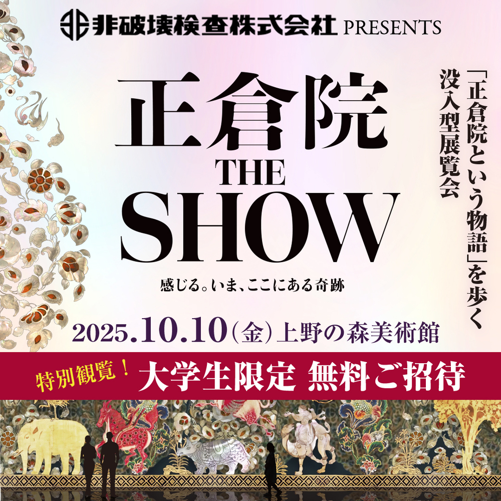 宮内庁正倉院事務所全面監修のもと、大阪展で10万人以上が訪れた「正倉院 THE SHOW」に、非破壊検査株式会社より特別貸切イベントとして大学生を無料招待いたします。