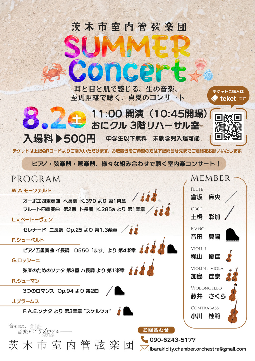 茨木市室内管弦楽団では、SUMMER Concertと題して、いつもより至近距離で、さらにアットホームな雰囲気の室内楽コンサートを開催いたします!
