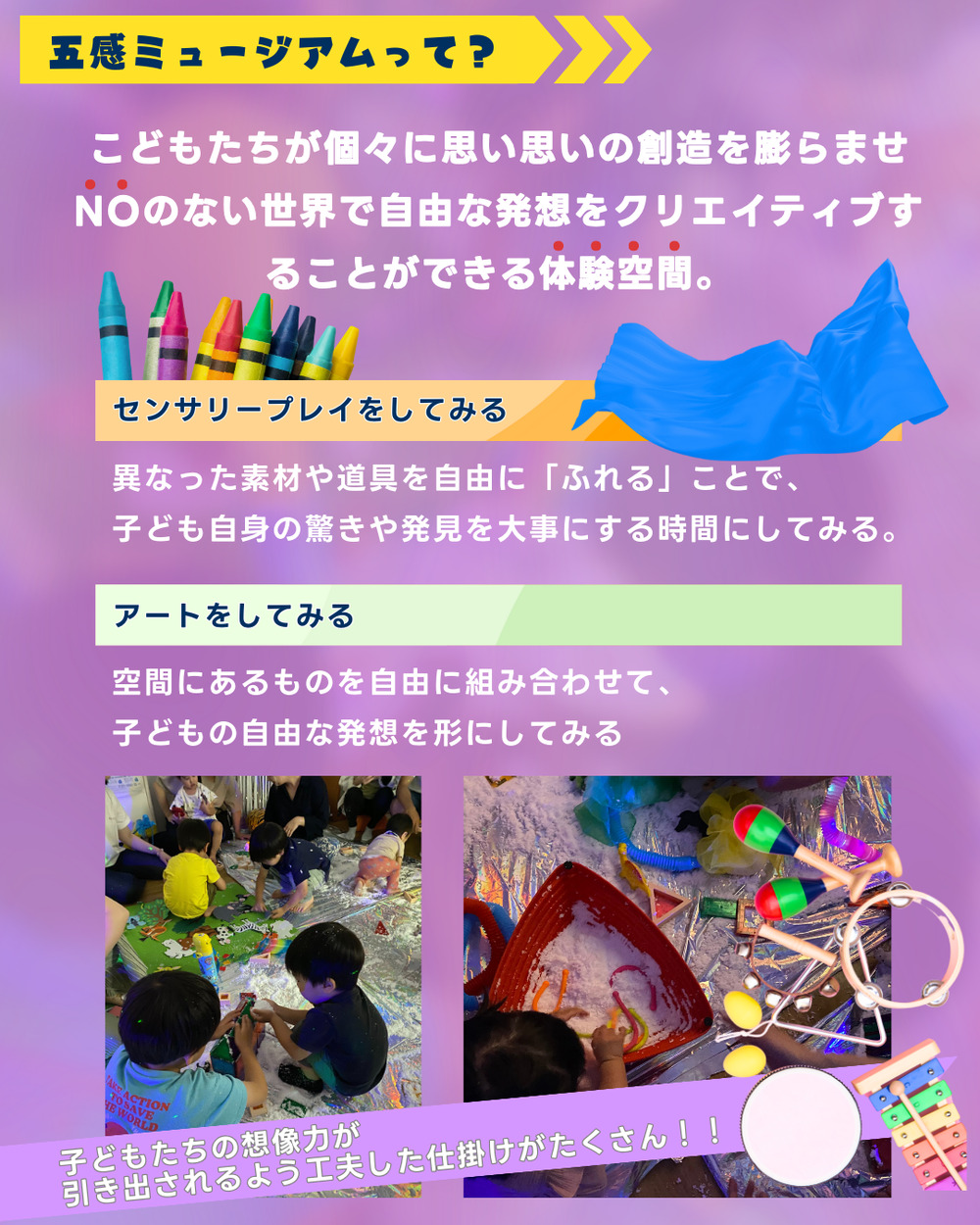 「見て、聞いて、触って、動いて…」普段できない特別な遊びが 安全な環境 で楽しめます!