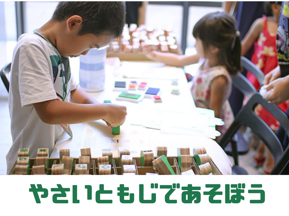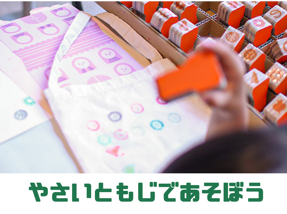ワワワオリジナルのひらがなやかわいくておもしろいかたちのおやさいの断面のハンコを、いろんな紙や布小物に、ペタペタ押してあそぶワークショップ。