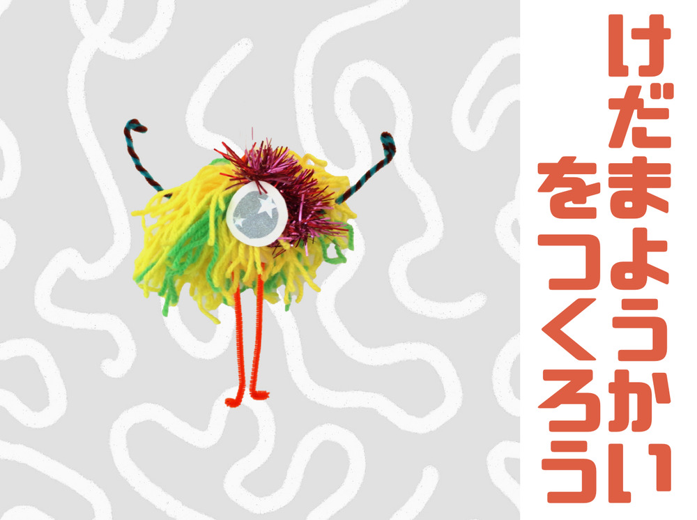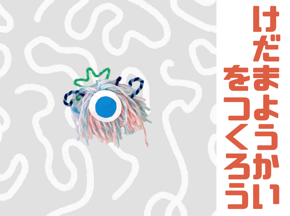 毛糸をつかったようかいづくりです。毛糸を巻いて、ハサミで切って、スポンジにとりつけて自分だけのけだまようかいをつくろう!