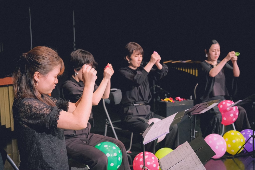 風船のみの作品。ポップな風船を使って色々な音が生まれます、目と耳で楽しむ作品。
