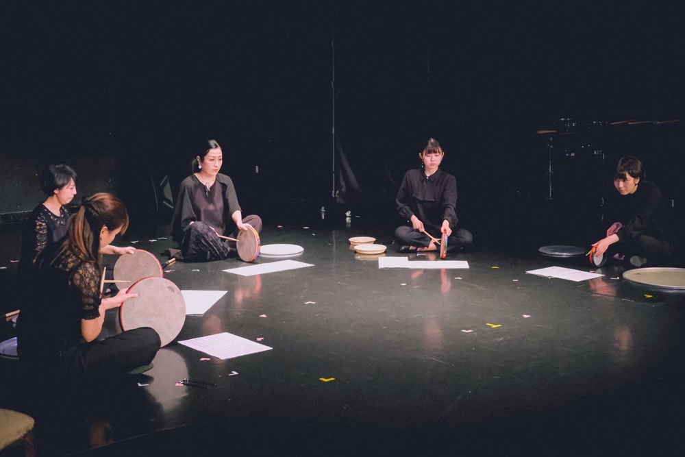 太鼓の皮を沢山使った作品。打ったり擦ったり投げたり転がしたり、賑やかな作品。