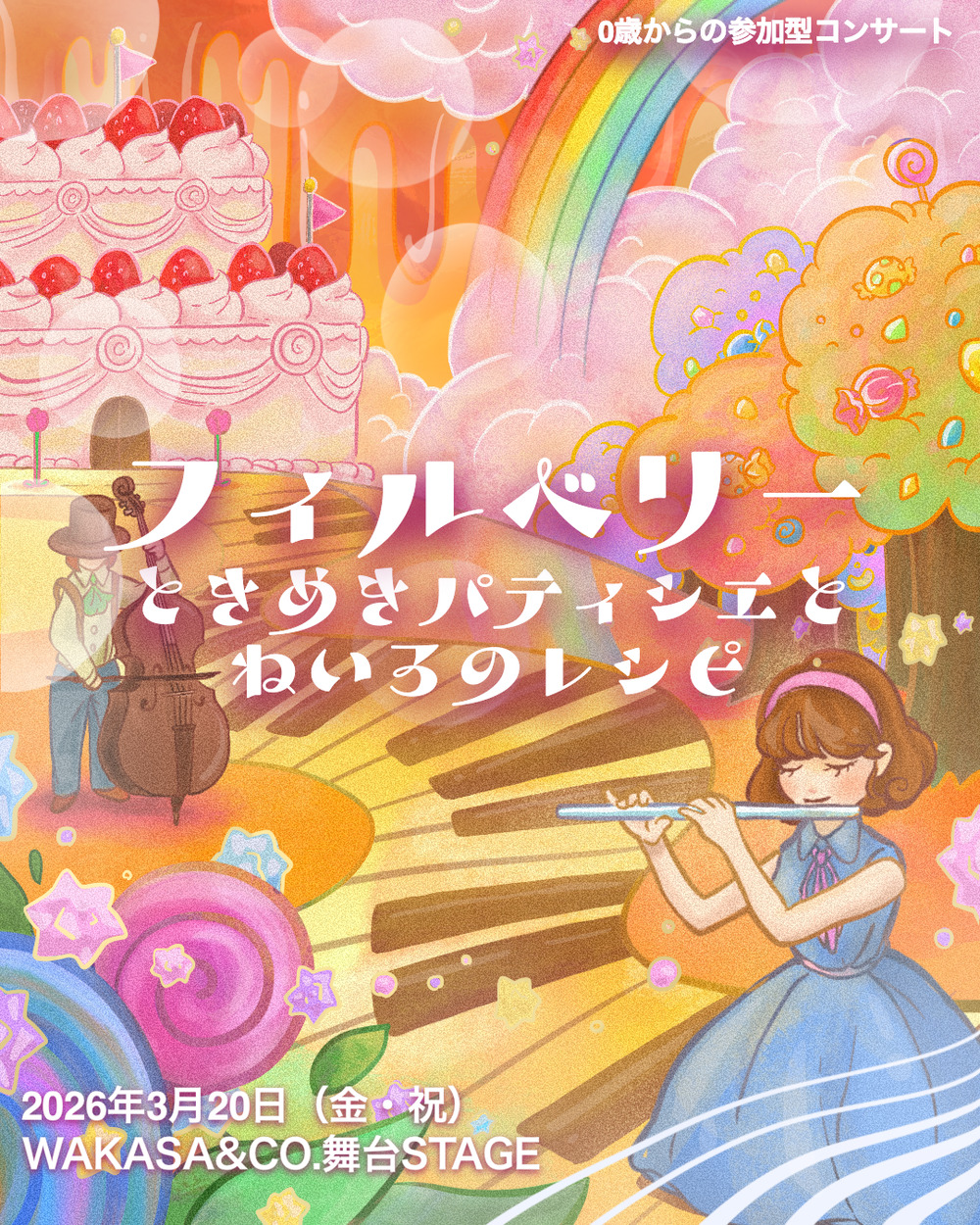 ここは音のパティスリー。ときめきパティシエが、フルートやコントラバスの音色を「材料」に、不思議なお菓子を作ります。リズムをまぜたり手拍子を重ねたり、みんなの力を合わせれば、おいしい音楽ケーキの出来上がり!でも、食べすぎて歯磨きせずに寝てしまったら……お口の中に虫歯のピンチが!?音楽の力でピンチを乗り越えたら、最後はみんなで華やかなパーティー!五感で楽しむ、おいしい参加型コンサートです✨