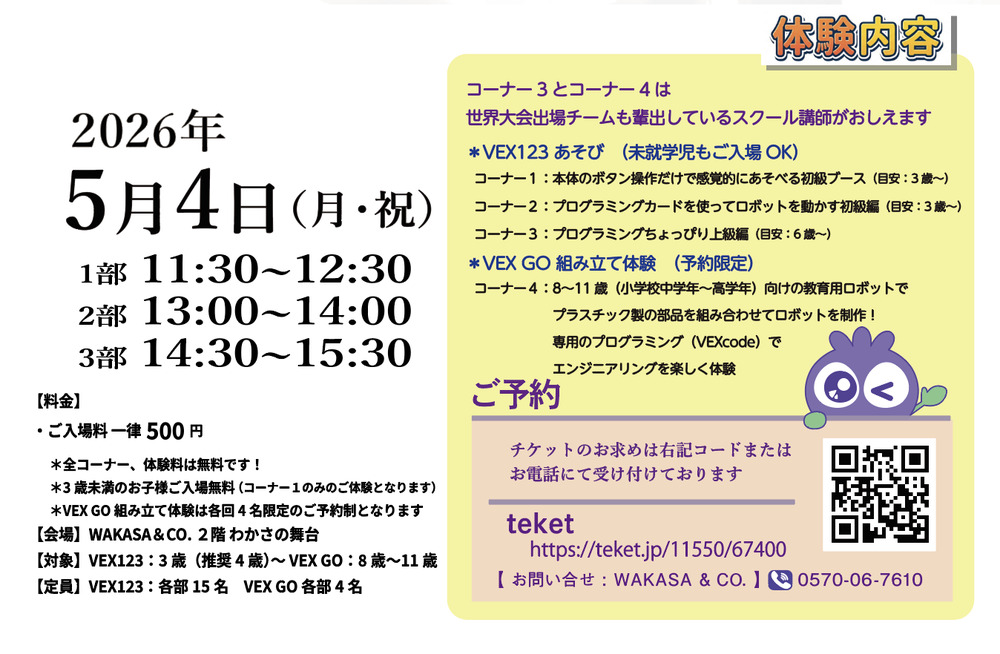 *VEX GO 組み立て体験をご予約の方は、別途入場料は必要ありません(体験予約のみでOKです)