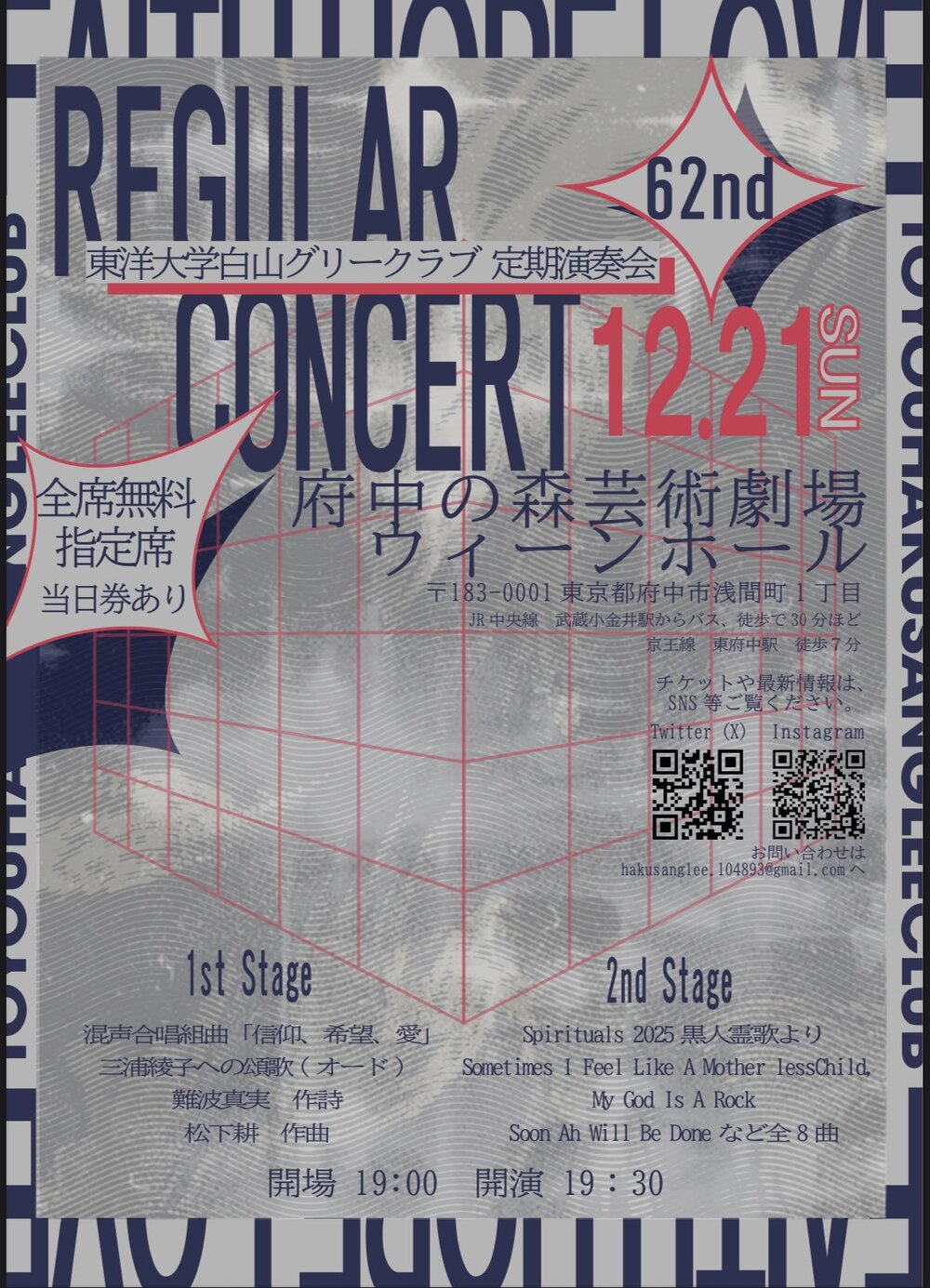 東洋大学の公認サークルです。60年以上の歴史を持ち、地域活動や定期演奏会など実績を重ねてきました。今年度は現役の1・2年生が中心となり試行錯誤の末の開催となりました。本演奏会では宗教的な響きを持つ合唱曲を中心に、悲観してしまうような現実から希望へ向かっていく祈りや願いを、ホールに響く音色と共にお届けします。ご来場お待ちしております!