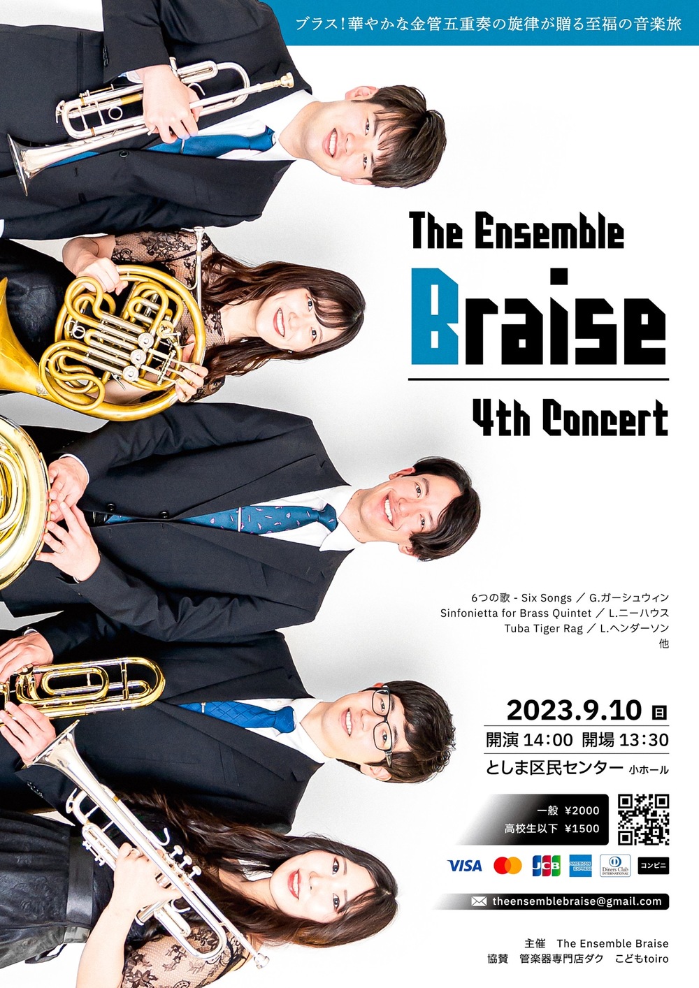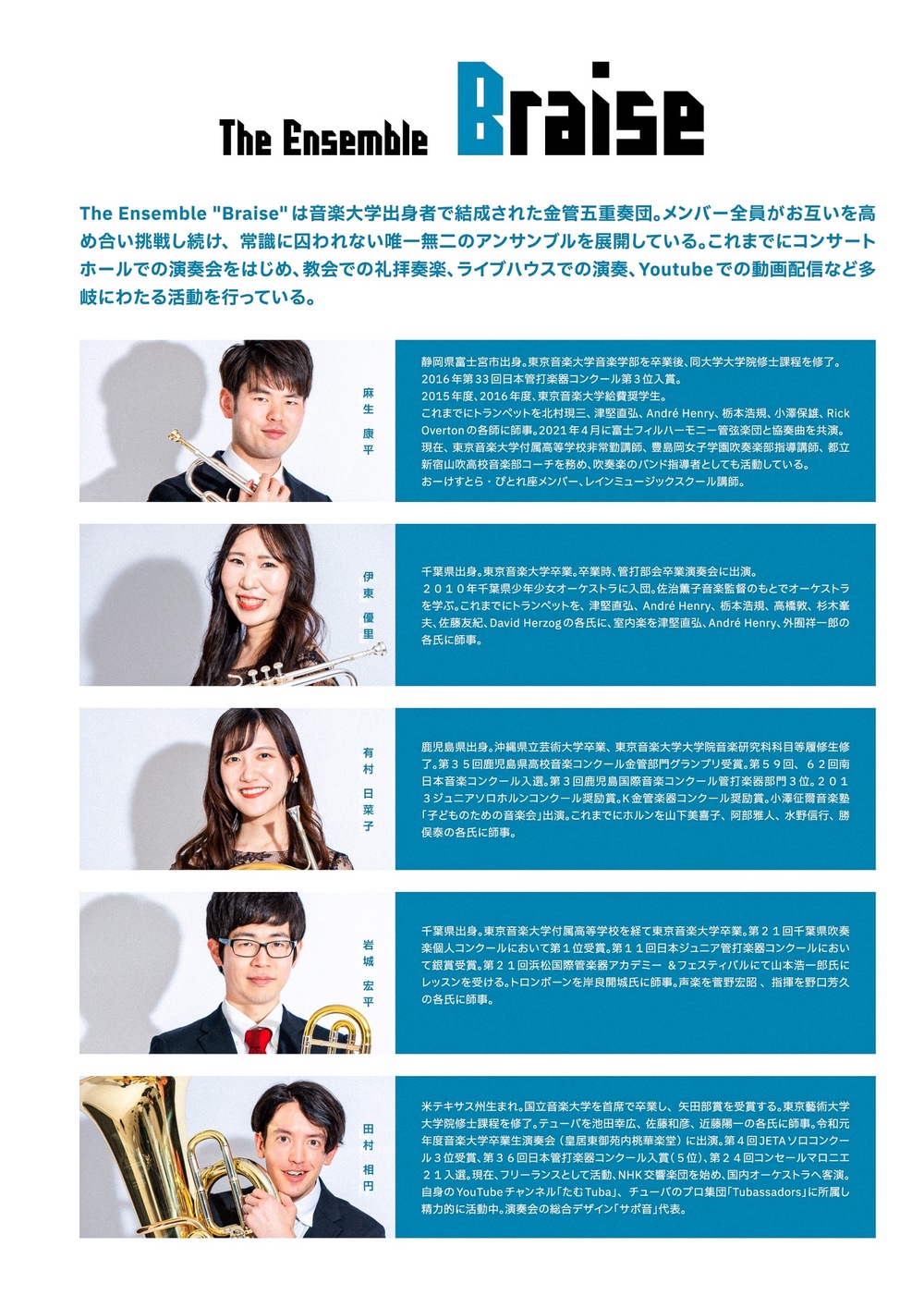 The Ensemble "Braise"は音楽大学出身者で結成された金管五重奏団。メンバー全員がお互いを高め合い挑戦し続け、常識に囚われない唯一無二のアンサンブルを展開している。これまでにコンサートホールでの演奏会をはじめ、教会での礼拝奏楽、ライブハウスでの演奏、Youtubeでの動画配信など多岐にわたる活動を行っている。