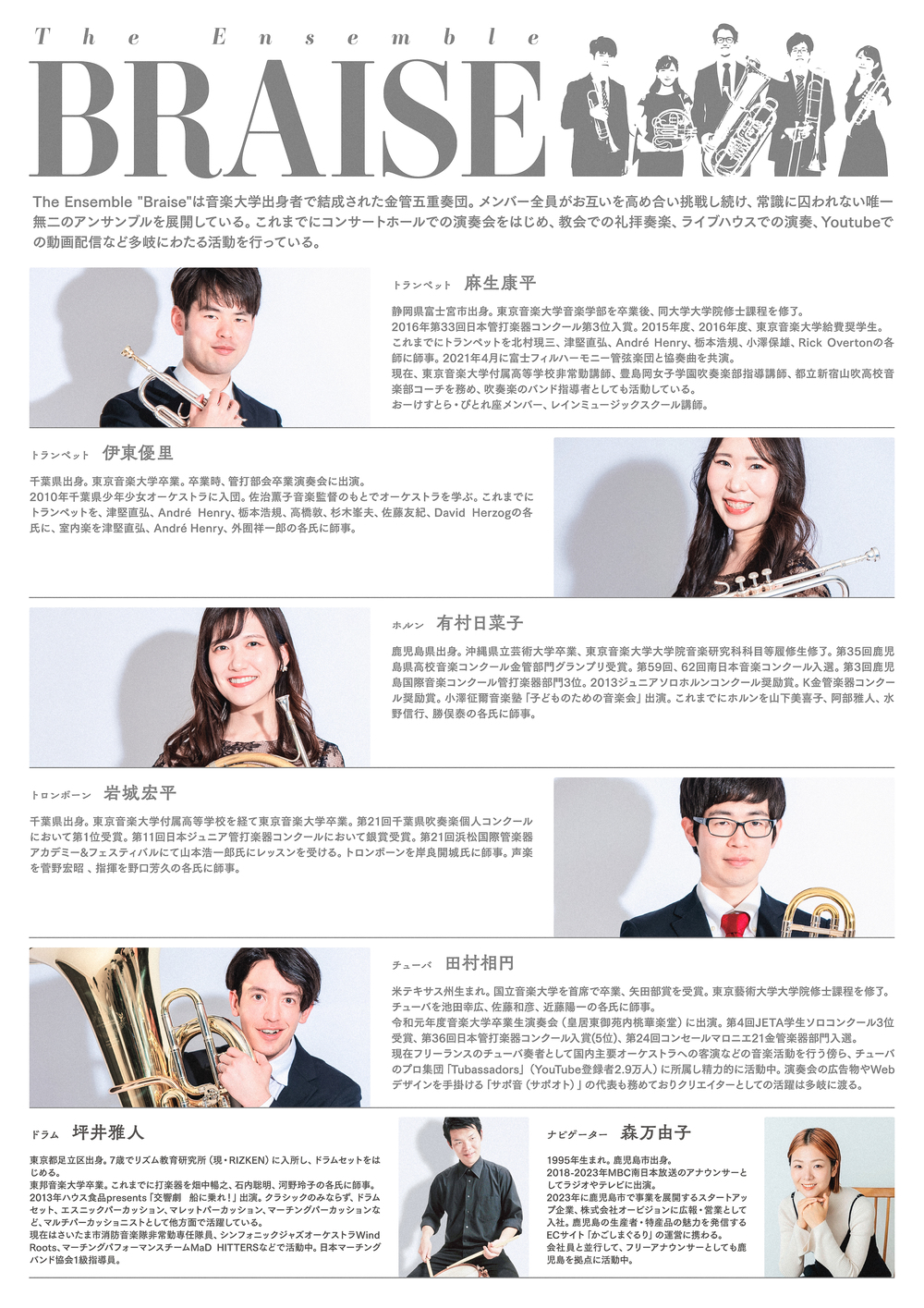 The Ensemble "Braise"は音楽大学出身者で結成された金管五重奏団。メンバー全員がお互いを高め合い挑戦し続け、常識に囚われない唯一無二のアンサンブルを展開している。これまでにコンサートホールでの演奏会をはじめ、教会での礼拝奏楽、ライブハウスでの演奏、Youtubeでの動画配信など多岐にわたる活動を行っている。