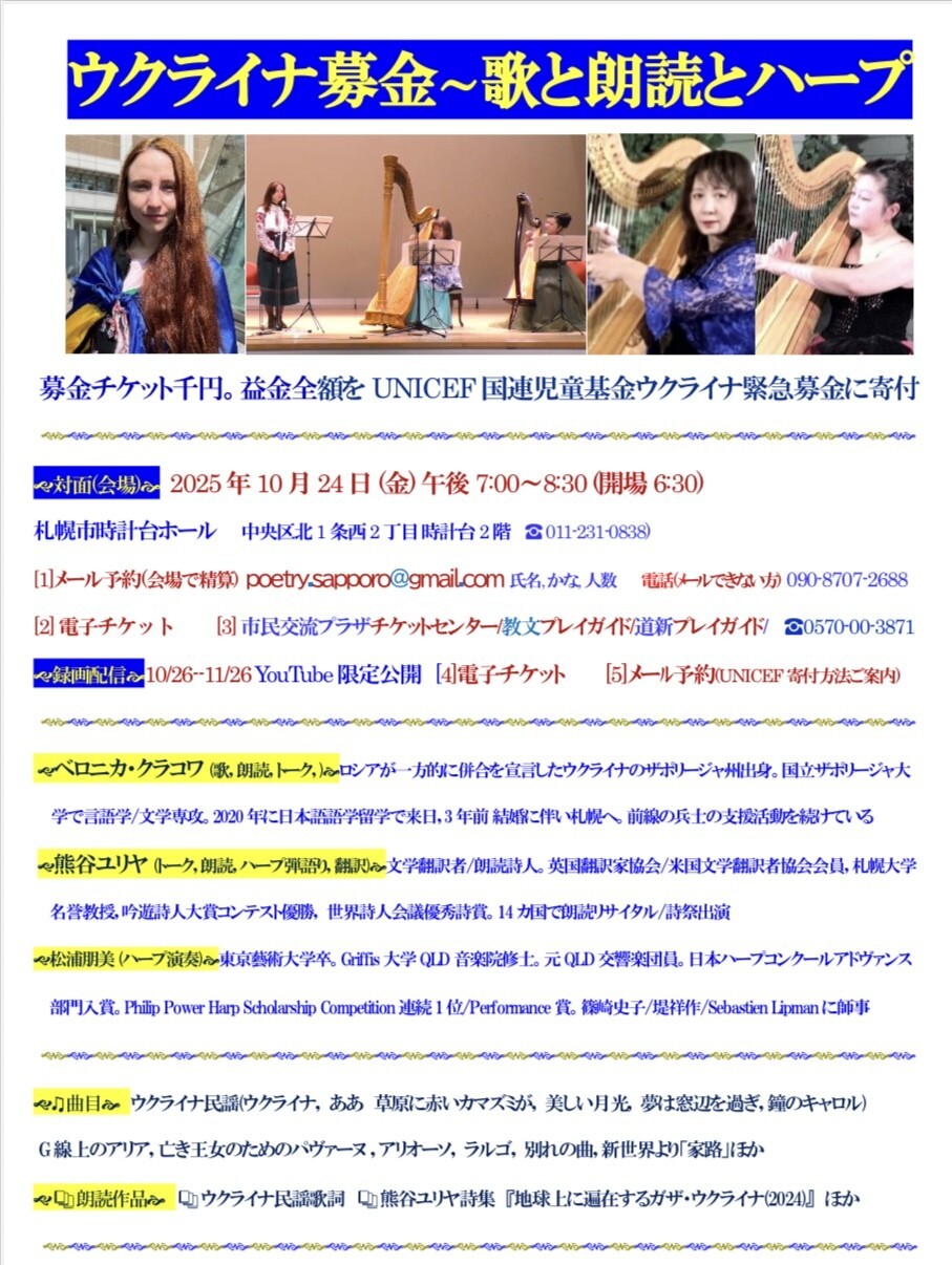 📚朗読作品(日本語・英語・ウクライナ語) 📚ウクライナ民謡歌詞 📚熊谷ユリヤ詩集『地球上に遍在するガザ・ウクライナ(2024)』 ほか