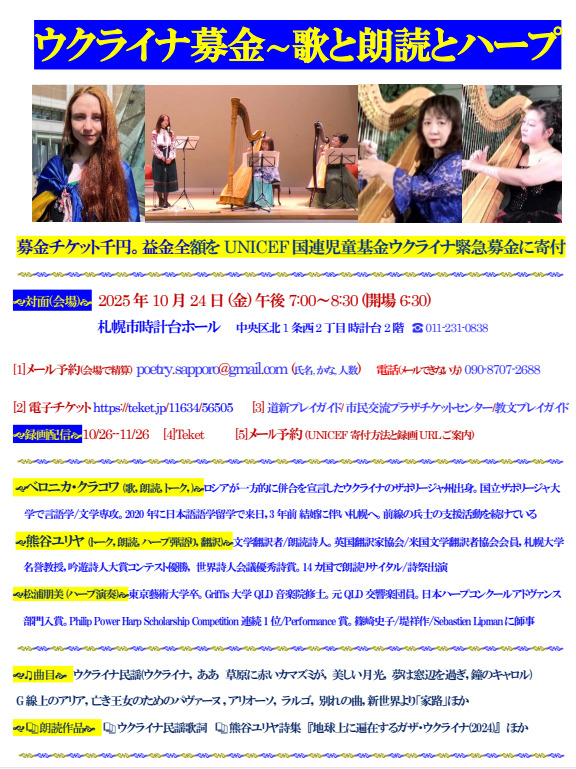 今回で6回目となるウクライナ支援・募金イベント。メロディーが美しいウクライナ民謡とウクライナへの愛を歌った歌詞、どこかで聞いた癒しのクラシックとウクライナの平和を祈る詩の朗読を、大型のグランドハーブ、中型のアイリッシュハープ、小型のサウルハープと三種類のハープにのせた演奏と弾語り。日本語によるトークを交えて。