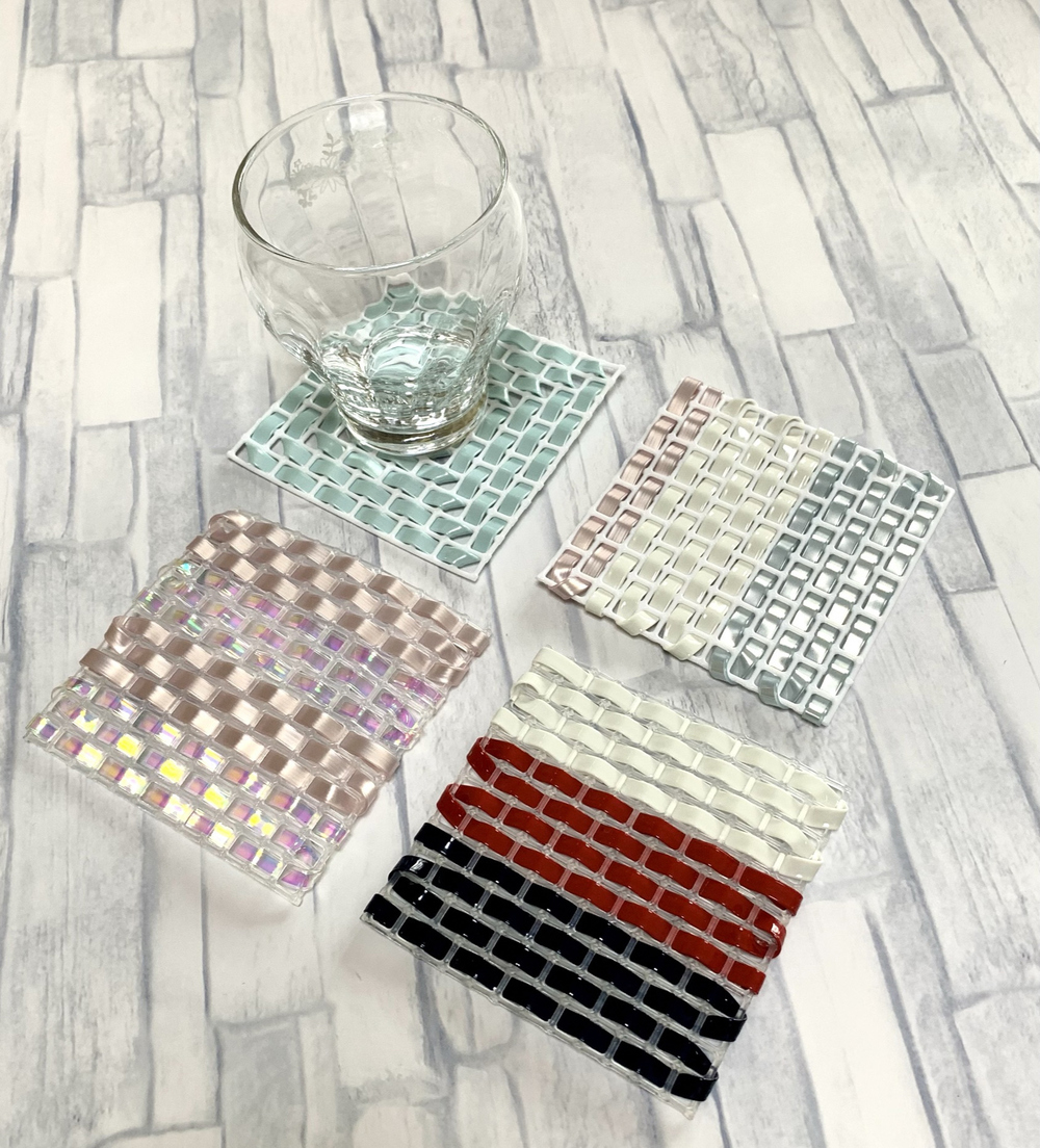 光沢のあるテープ(ビニール素材)を使ってお好きな色のオリジナルコースターを作りましょう。小さなお子様でも簡単です。