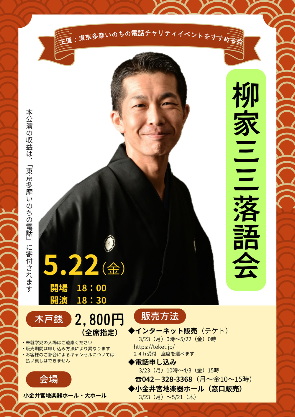 東京多摩いのちの電話の目的に賛同し、活動を支援するために、定期的にコンサート、落語会などのチャリティイベント等を開催します。