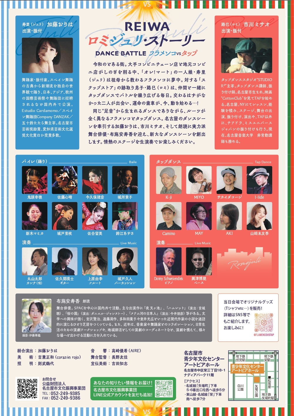 同じ“足音”から生まれるダンスでありながら、ルーツが全く異なるフラメンコとタップダンス。名古屋のダンスシーンを牽引する加藤おりは、市川ミサオ、そして朗読に実力派舞台俳優・布施安寿香を迎え、新たなダンスシーンを創出します。情熱のステージを生演奏でお楽しみください。
