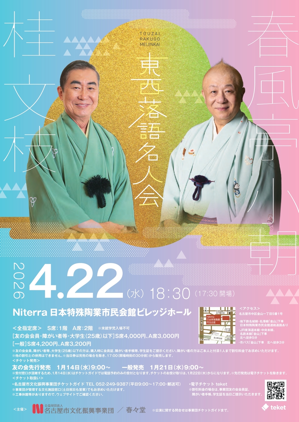 毎年恒例、大好評の東西落語の大看板、文枝師匠・小朝師匠の夢の顔合わせ!