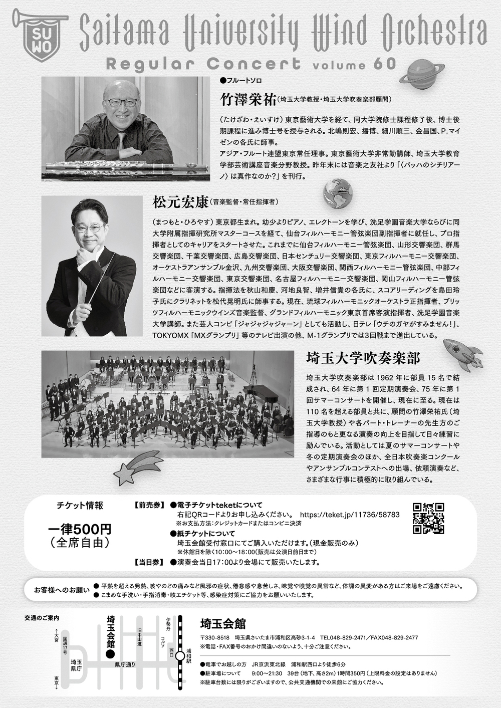 当部顧問である竹澤栄祐先生(埼玉大学教授)をソリストに迎えたフルートコンチェルト『フルート協奏曲(原曲:ヴァイオリン協奏曲)ホ短調 作品64』(メンデルスゾーン作曲/庄司燦編曲)をはじめ、演奏会のメイン曲『宇宙の音楽』(フィリップ・スパーク作曲)など、名曲ぞろいのステージをお楽しみいただけます。