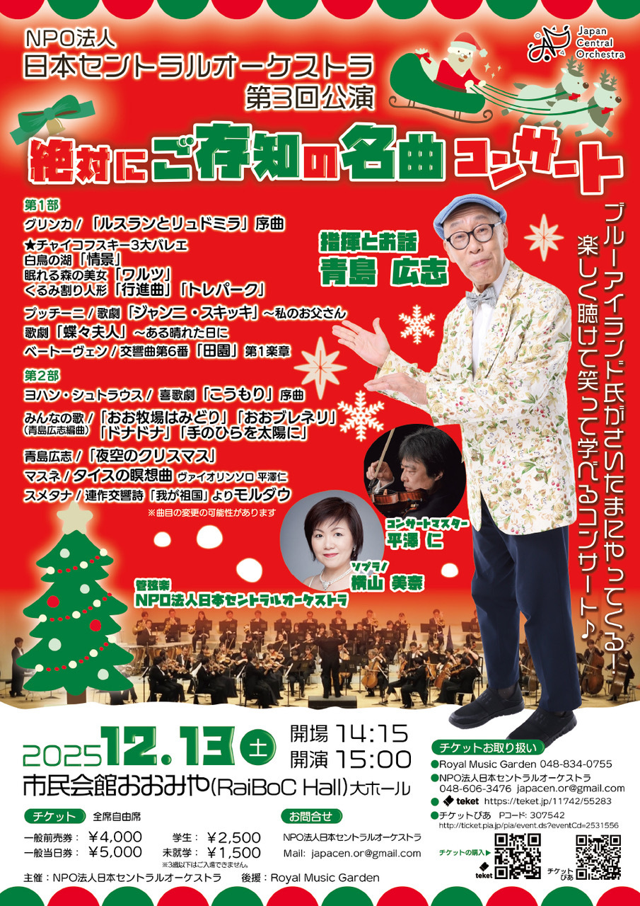 NPO法人日本セントラルオーケストラ 2023年8月に発足後、さいたま市を拠点としたプロの演奏家の団体として同年12月に さいたま市文化センター大ホールに第一回の公演は沢山の好評を得た。 社会に役立つオーケストラとして、各企業、個人様からの支援金を得ながら、 病院の患者様向けに無償の依頼演奏をおこなっている、今後は、 日本全国の患者様や、入院中の子ども達へ演奏を届ける事を目標としている。