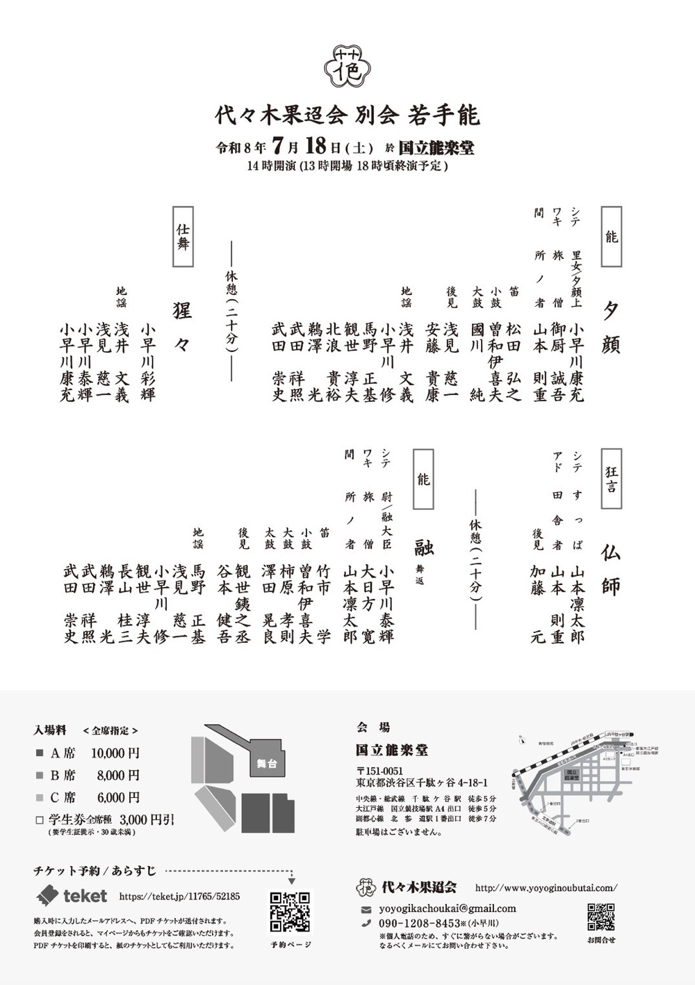 所の男(アイ)から『源氏物語』の夕顔のエピソードについて聞いた僧が弔うと、夕顔の霊(後シテ)が登場し、罪深い我が身を弔ってほしいと僧に頼み、往時を懐かしみ舞を舞います。