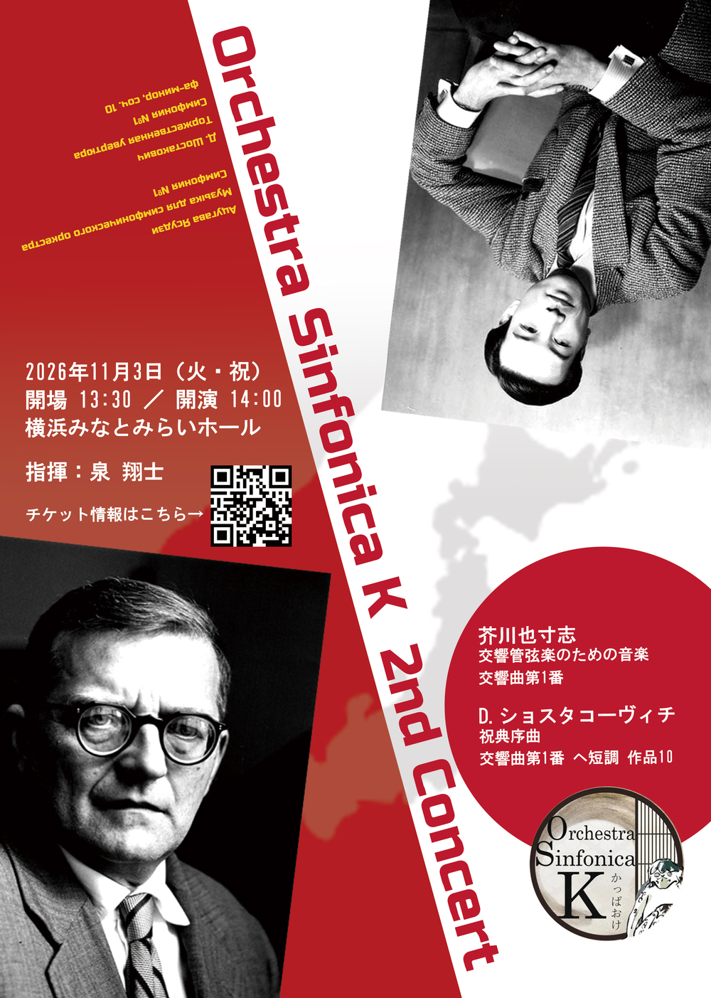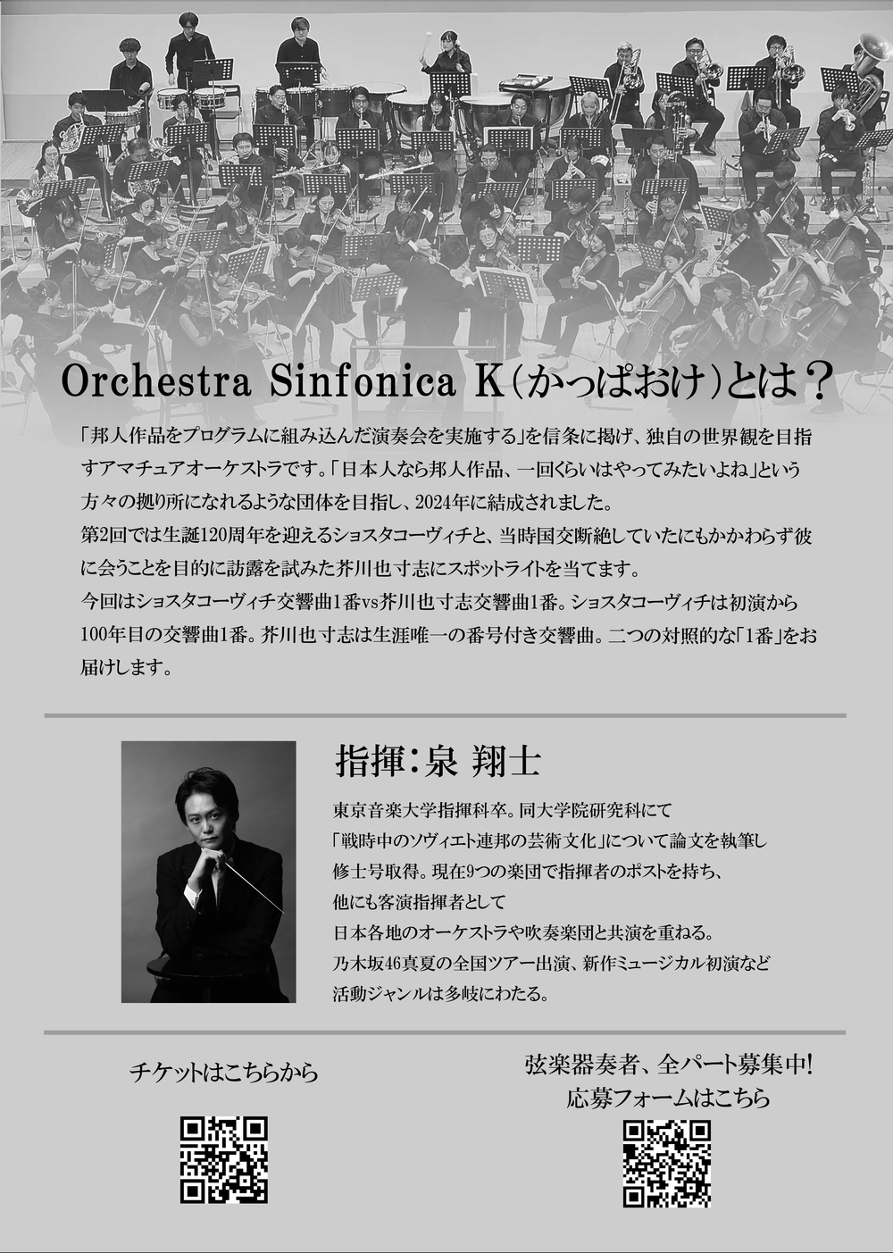 「邦人作品をプログラムに組み込んだ演奏会を実施する」を信条に掲げ、独自の世界観を目指すアマチュアオーケストラです。「日本人なら邦人作品、一回くらいはやってみたいよね」という方々の拠り所になれるような団体を目指し、2024年に結成されました。第2回では生誕120周年を迎えるショスタコーヴィチと、当時国交断絶していたにもかかわらず彼に会うことを目的に訪露を試みた芥川也寸志にスポットライトを当てます。今回はショスタコーヴィチ交響曲1番vs芥川也寸志交響曲1番。ショスタコーヴィチは初演から100年目の交響曲1番。芥川也寸志は生涯唯一の番号付き交響曲。二つの対照的な「1番」をお届けします。