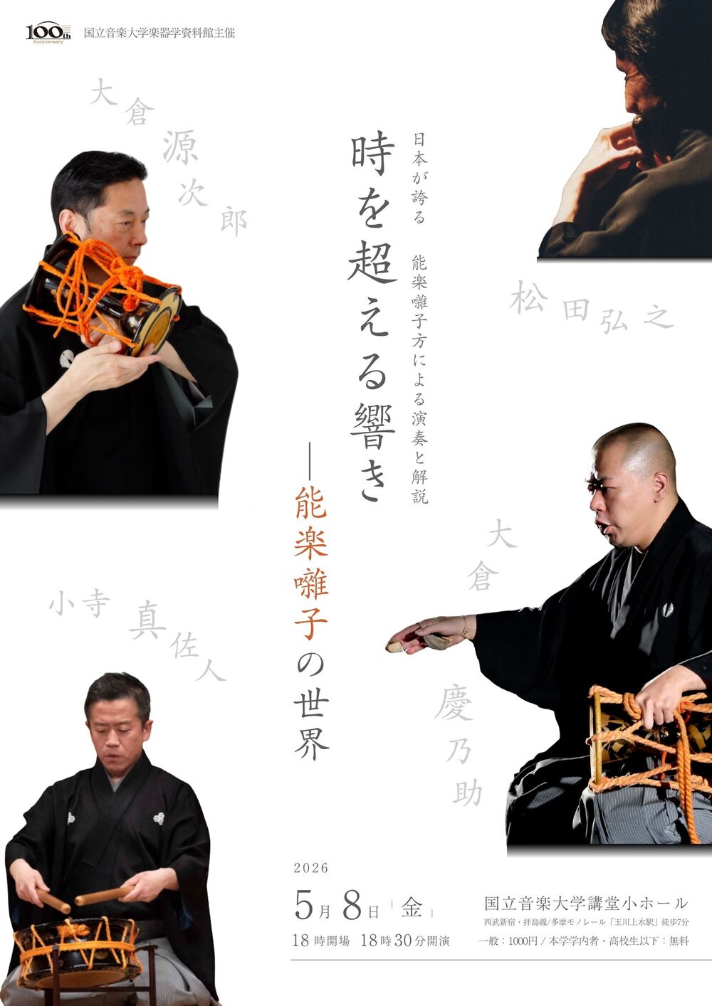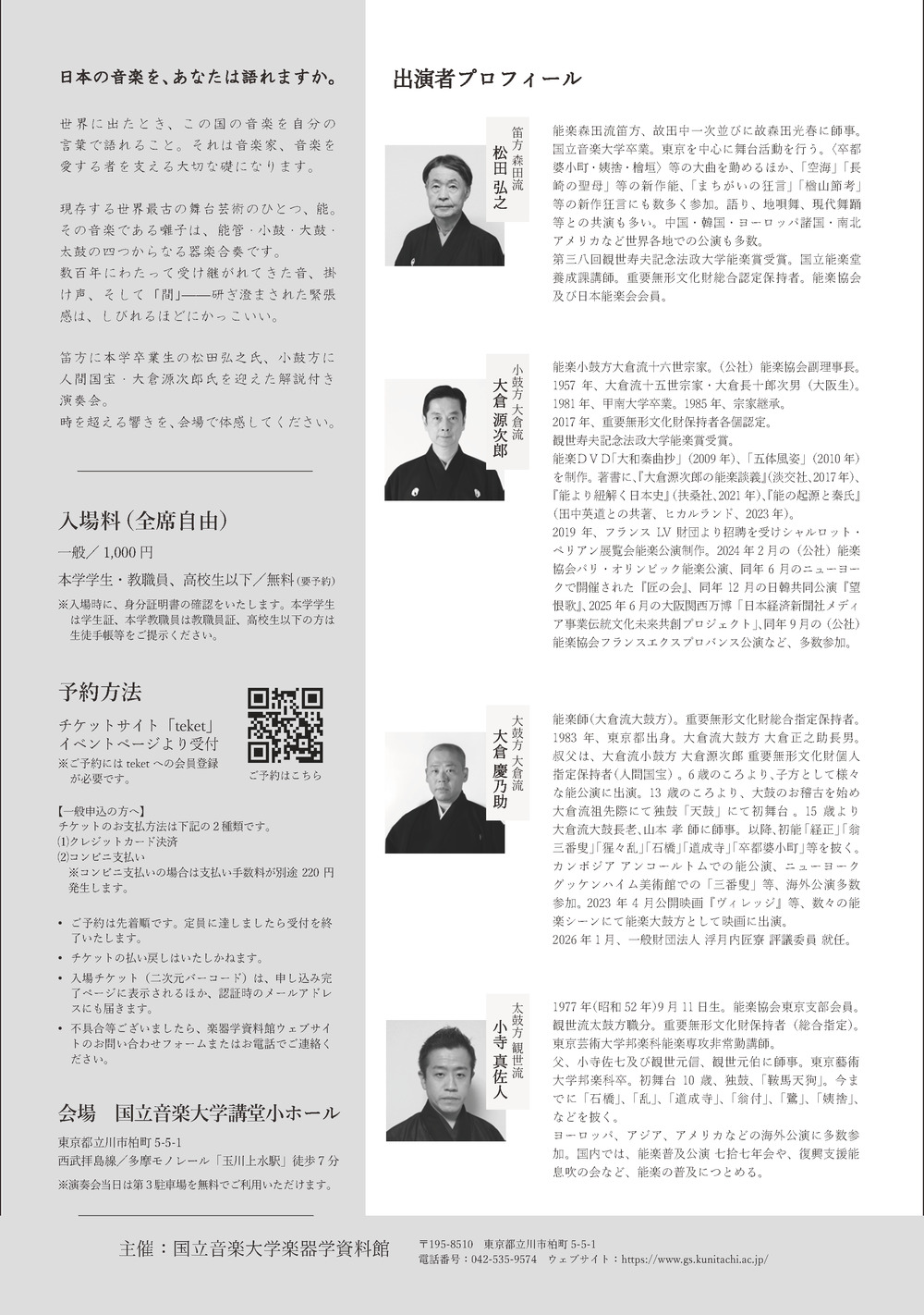 笛方に本学卒業生の松田弘之氏、小鼓方に人間国宝・大倉源次郎氏を迎えた解説付き演奏会。