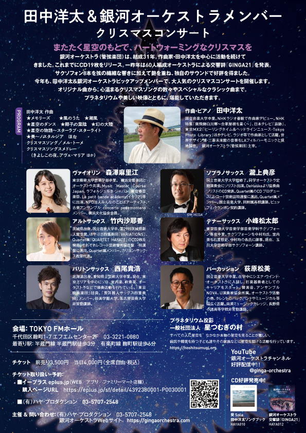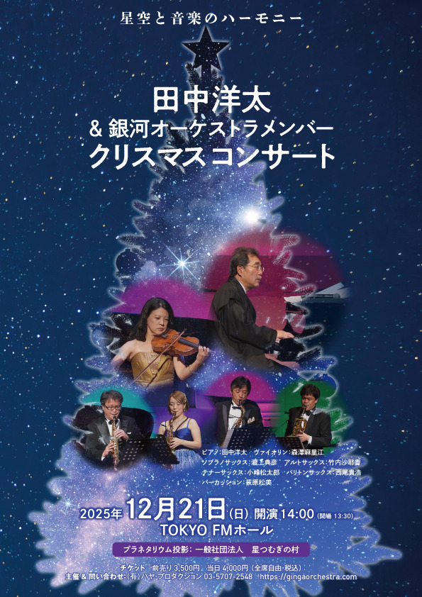 今年も田中洋太&銀河オーケストラピックアップメンバーによる、人気のクリスマスコンサートを開催します。ホールにはプラネタリウムや美しい映像も投影! きらめく星空の中で、ハートウォーミングなクリスマスをお楽しみください。