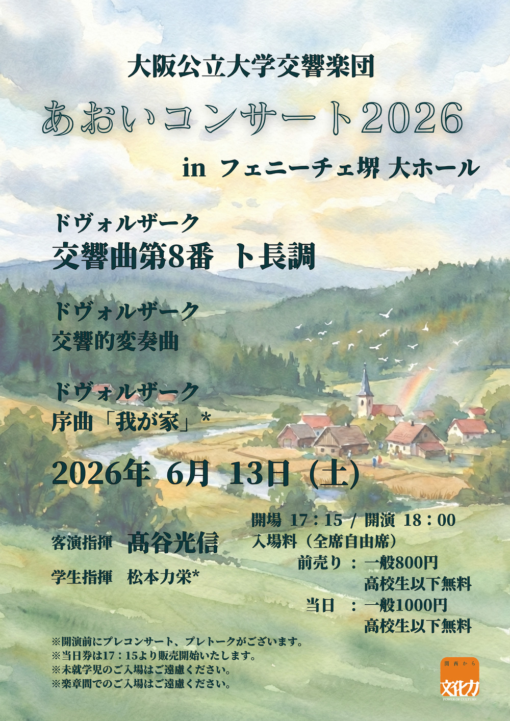 大阪公立大学交響楽団となってから4回目のあおいコンサートが今年も開催されます。今回は客演指揮者として髙谷光信先生をお迎えし、メインはドヴォルザークの交響曲第8番を演奏いたします。このほか、ドヴォルザーク作曲の交響的変奏曲、ドヴォルザーク作曲の序曲「我が家」をお送りいたします。お聞き逃しなく!
