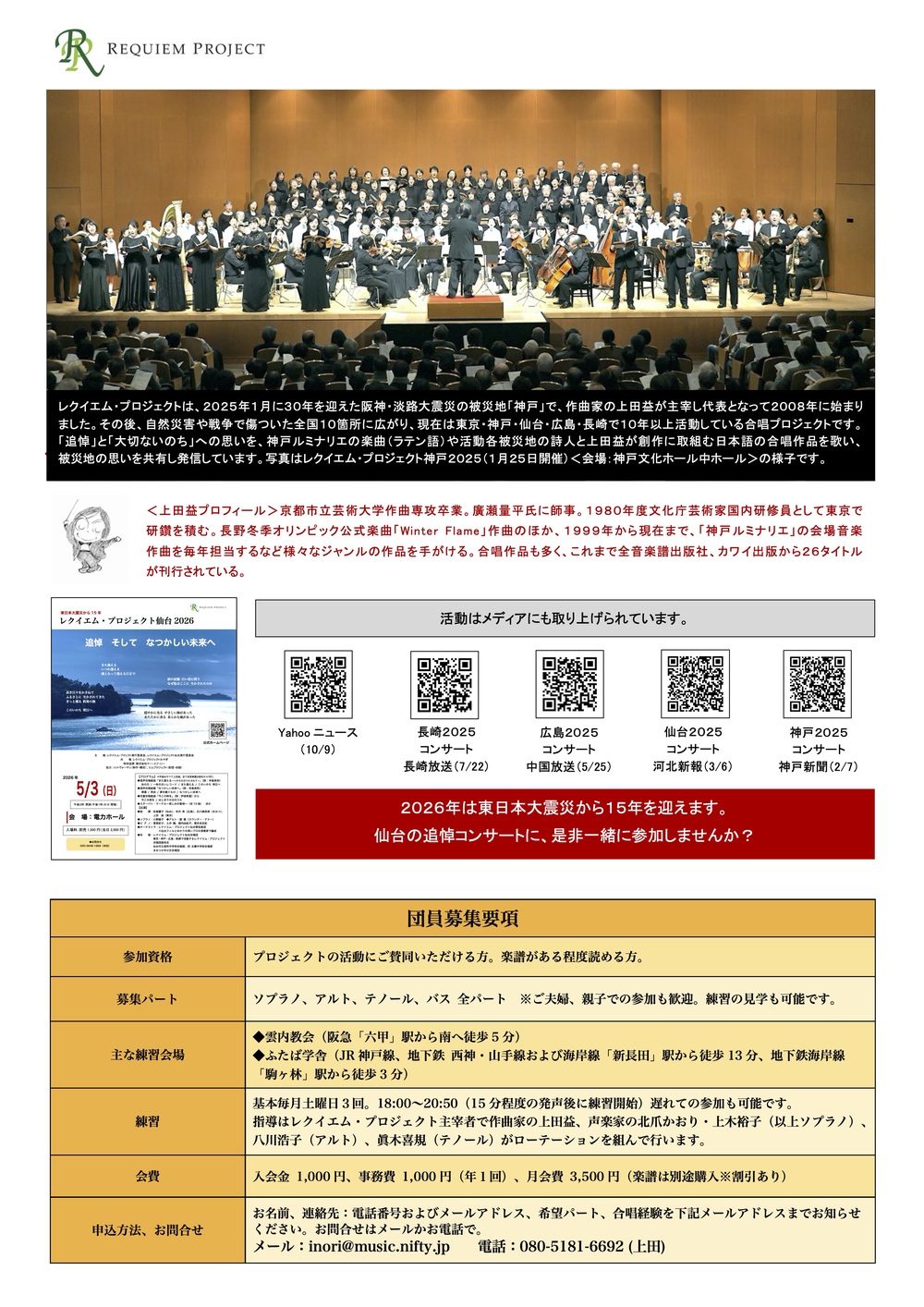 その上田益が主宰して2008年に神戸で始まったのが、追悼と希望の合唱プロジェクト「レクイエム・プロジェクト」。