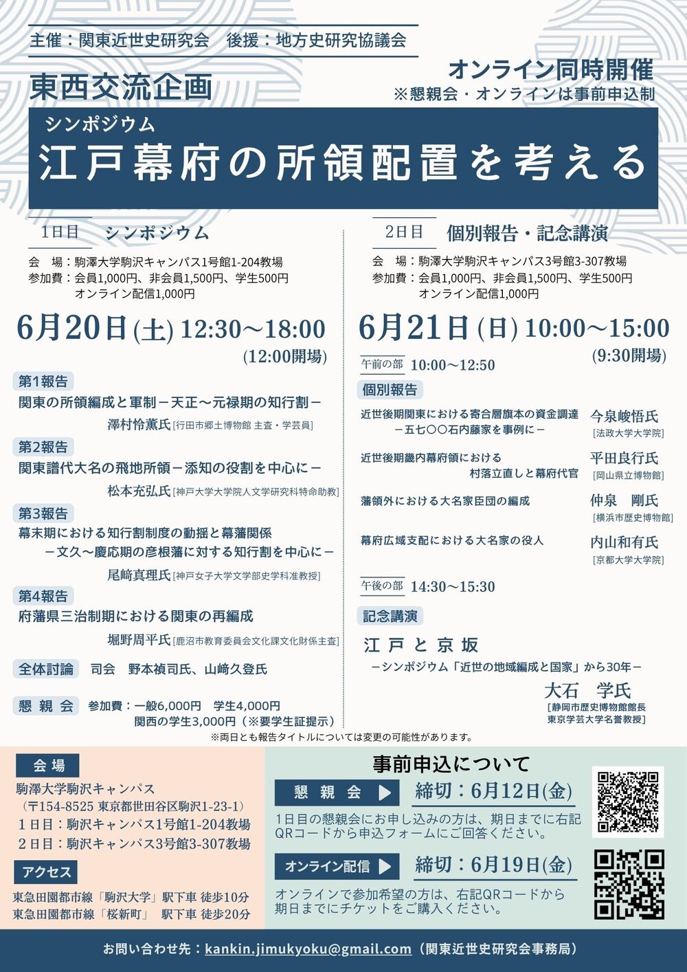 当会では、東西交流企画として、シンポジウム「江戸幕府の所領配置を考える」及び個別報告・記念講演を下記のとおり開催いたします。皆様方におかれましては、ご多忙のことと存じますが、御高見を賜りたくご案内申し上げます。ぜひご参加くださいますようお願い申し上げます。