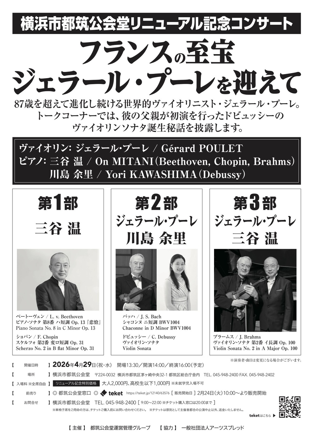 87歳を超えて進化し続ける世界的ヴァイオリニスト・ジェラール・プーレ。トークコーナーでは、彼の父親が初演を行ったドビュッシーのヴァイオリンソナタ誕生秘話を披露します。