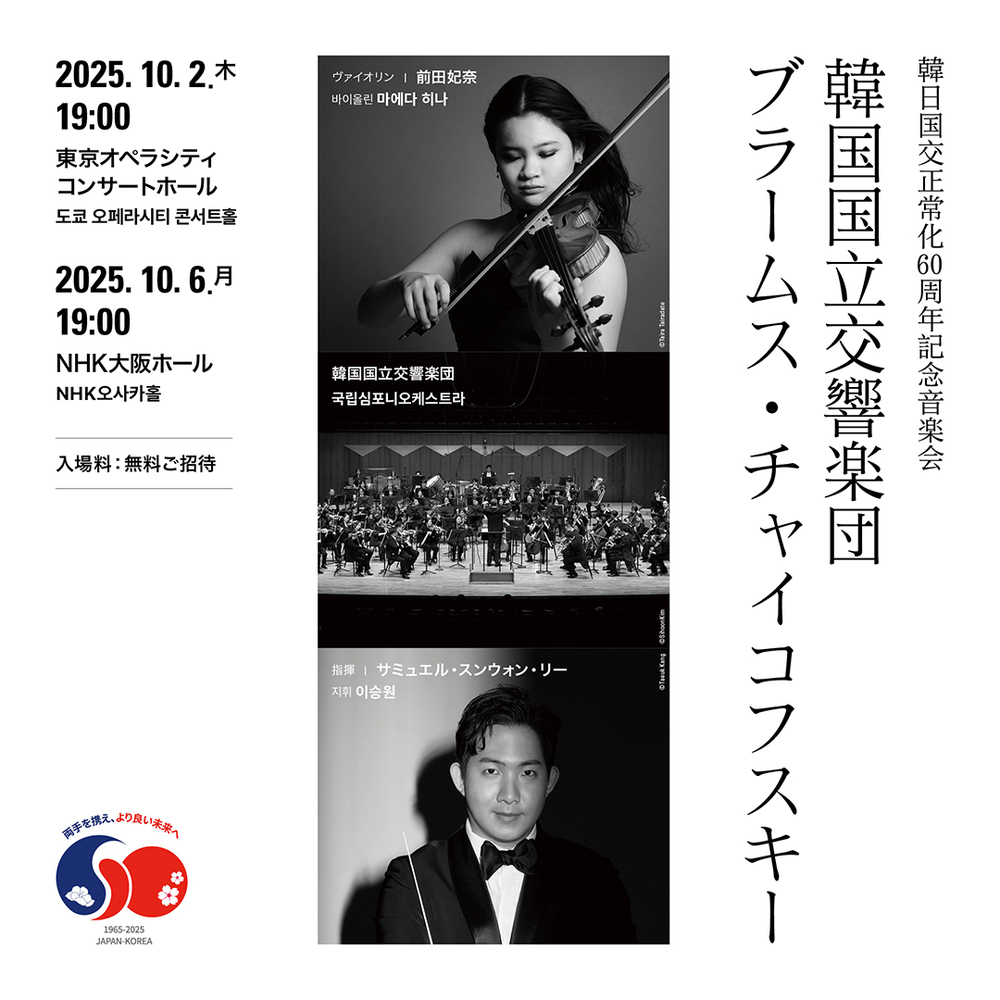 当公演ではブラームスのヴァイオリン協奏曲とチャイコフスキーの交響曲第5番が演奏され、韓国の新進気鋭の指揮者サミュエル・スンウォン・リーと日本の若手ヴァイオリニスト前田妃奈が共演し、世代と国境を越えた特別な音楽的出会いを創り出します。韓国国立交響楽団はこの公演を通じて、音楽という共通の言語で両国間の文化的絆を新たに紡ぎ、観客の心に深い感動を届けます。