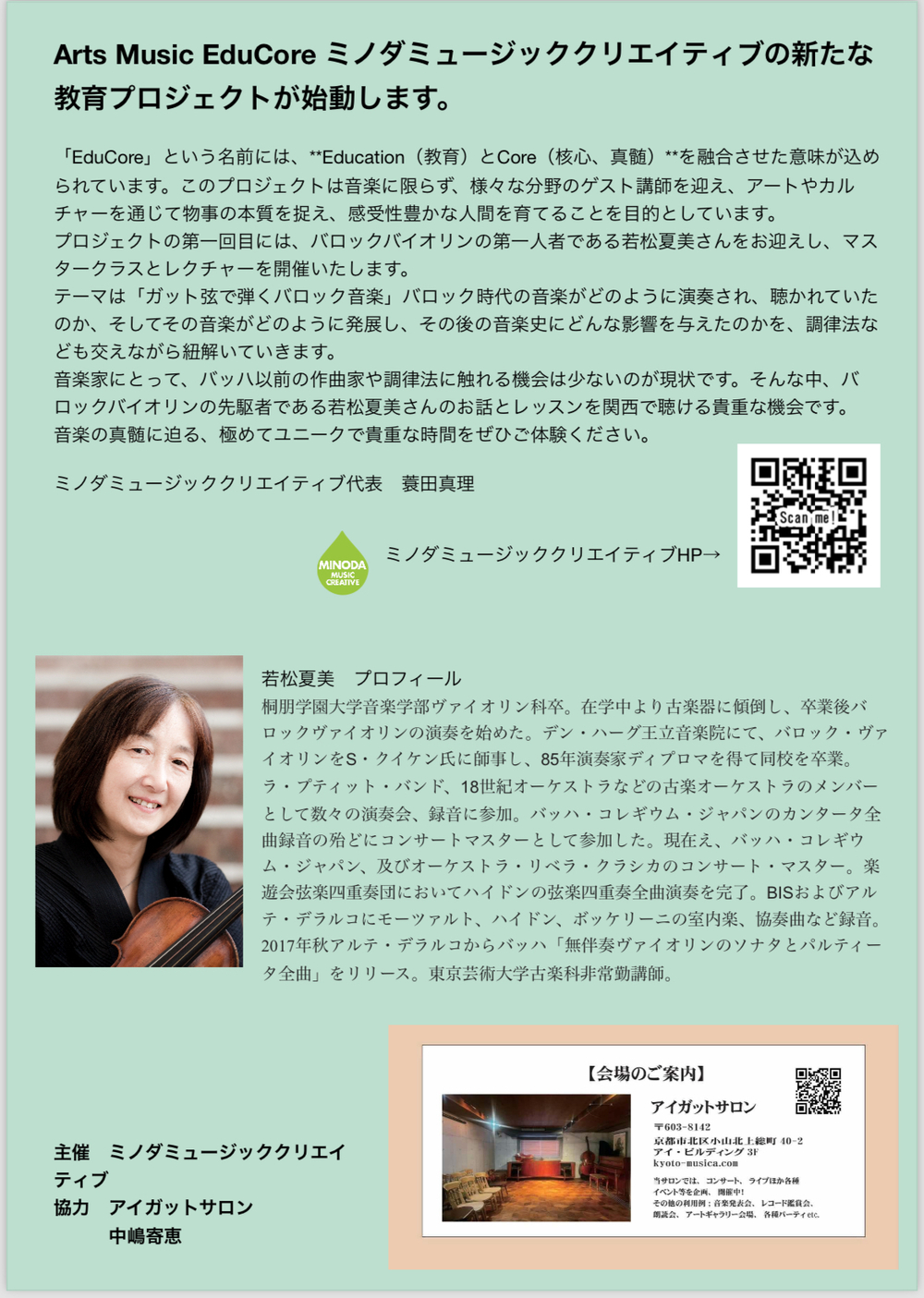 音楽家にとって、バッハ以前の作曲家や調律法に触れる機会は少ないのが現状です。そんな中、バロックバイオリンの先駆者である若松夏美さんのお話とレッスンを関西で聴ける貴重な機会です。