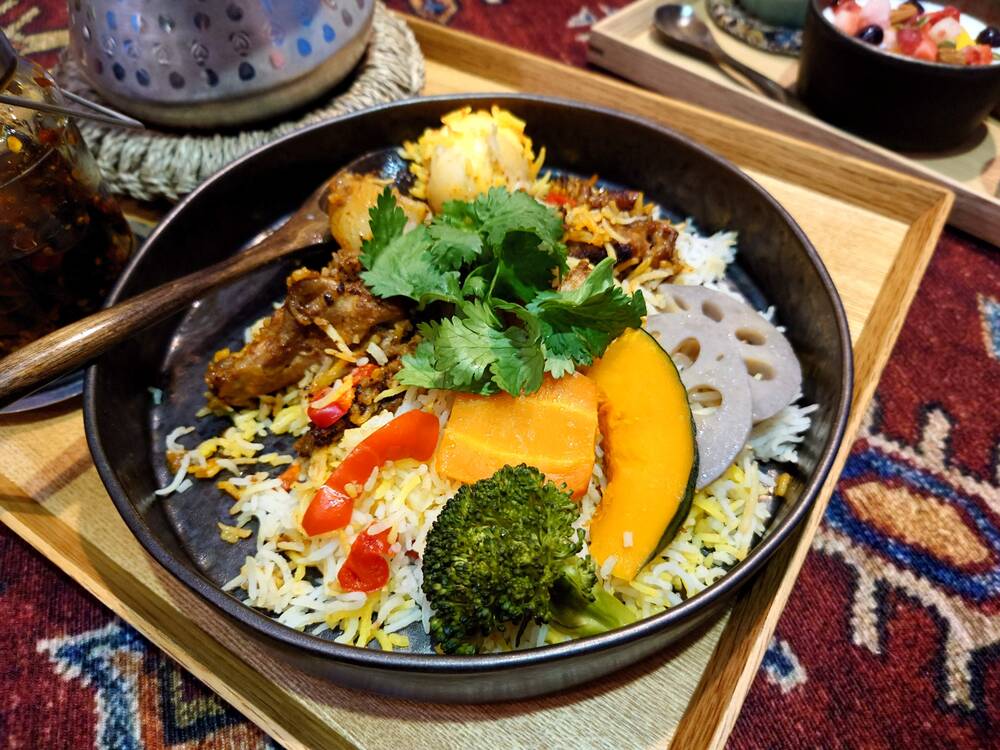 ビリヤニの他にライタ(ヨーグルトサラダ)、モロッカンサラダ、バラナシ名物の食べるラッシー、北インドのチャイが付きます。