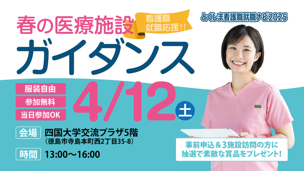 徳島県内の医療・介護施設への就職を目指す看護学生や、転職・復職を目指す有資格者、看護職に興味のある方を対象にした対面式就職ガイダンスを開催します。各施設の担当者が職場の魅力や特徴などを説明します。参加者全員に500円分のクオカードをプレゼント!参加施設は徳島新聞広告・とくしま就活ナビWEBにて随時掲載。※参加特典は一部変更しております。