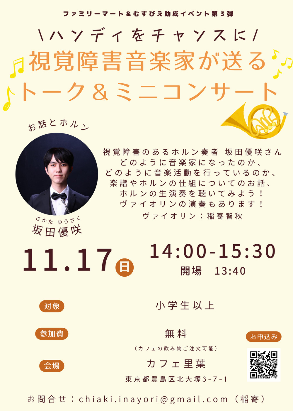 東京音楽大学初の点字入学のお話しや、オーケストラでの演奏について、点字楽譜なども実際にお持ちいただき、どのように音楽家になったのか、現在どのように音楽活動をしているのか、ホルンの演奏とともにお話しします。