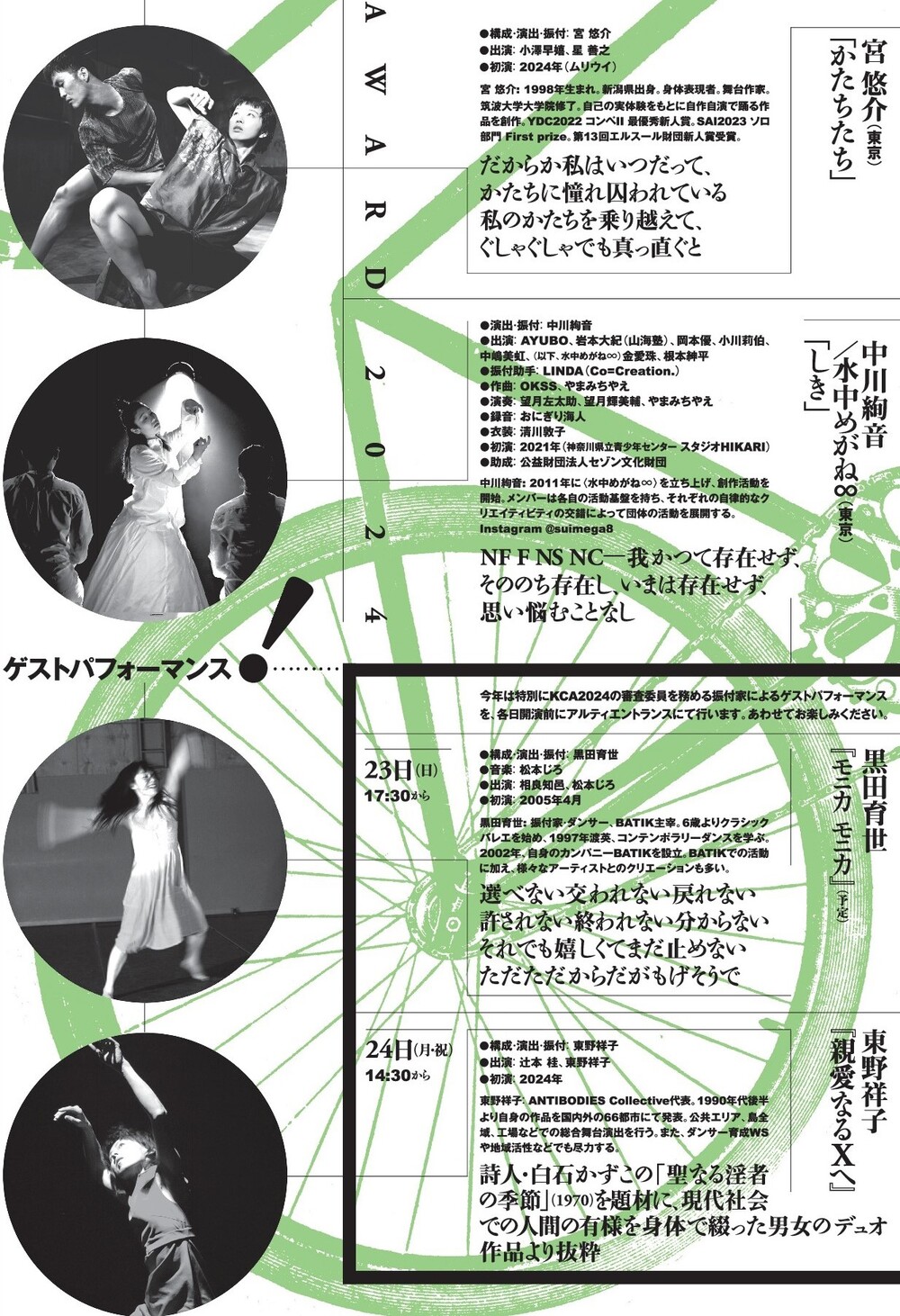 今年は特別にKCA2024の審査委員を務める振付家によるゲストパフォーマンスを、各日開演前にALTIロビーにて行います。あわせてお楽しみください。