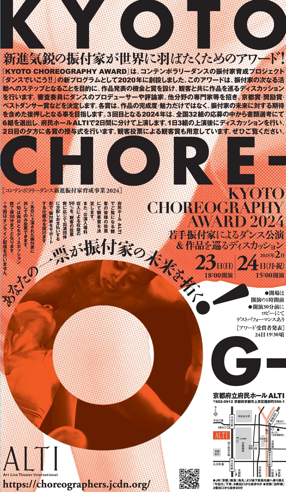 『KYOTO CHOREOGRAPHY AWARD』は、コンテンポラリーダンスの振付家育成プロジェクト「ダンスでいこう‼」の新プログラムとして2020年に創設しました。このアワードは、振付家の次なる活動へのステップとなることを目的に、作品発表の機会と賞を設け、観客と共に作品を巡るディスカッションを行います。審査委員にダンスのプロデューサーや評論家、他分野の専門家等を招き、京都賞・奨励賞・ベストダンサー賞などを決定します。各賞は、作品の完成度・魅力だけではなく、振付家の未来に対する期待を含めた後押しとなる事を目指します。